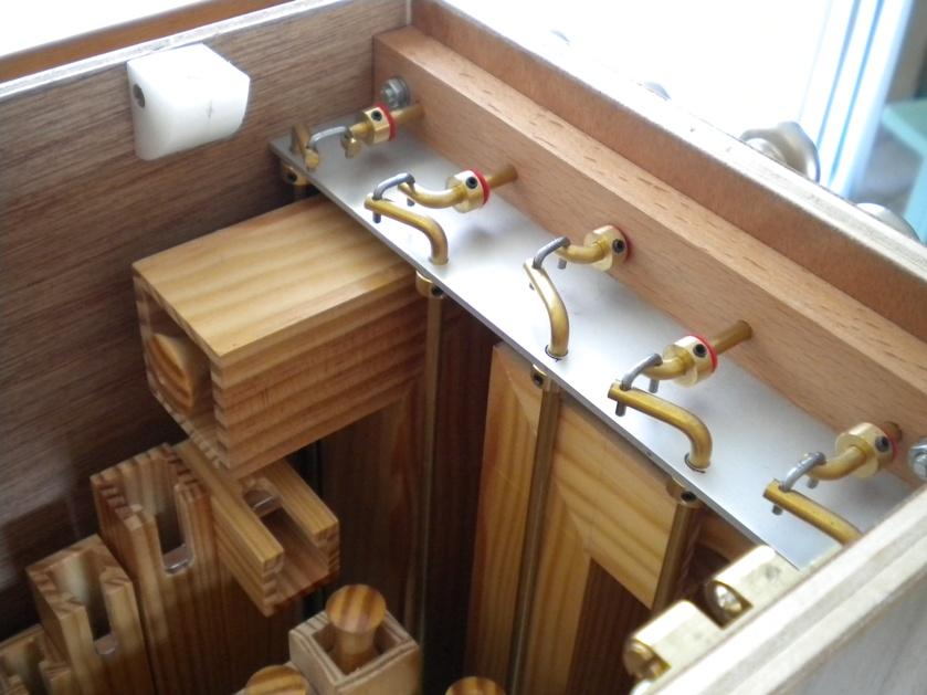 Habituellement, sur les orgues d'origine germanique, les commandes de registres sont situées sur le côté gauche au niveau du sommier et on actionne directement les réglettes. Avec un orgue qui passe des cartons, il suffit de faire l'exercice d'essayer d'atteindre ce point pendant que l'on tourne pour se rendre compte que ce n'est pas très commode, et que le carton côté débiteur constitue un obstacle à cette opération. C'est pourquoi j'ai déporté ces commandes en haut de ce même côté. La solution retenue vaut ce qu'elle vaut et j'en avais également envisagé d'autres. Celle-ci est assez discrète, et permet de placer 5 commandes dans un espace réduit, tout en gardant de la place pour loger encore 3 tuyaux derrière. Oui je sais c'est chaud, mais ça passe. C'est entièrement démontable bien sûr, et suffisamment accessible pour l'accord des tuyaux. Toutes les pièces en laiton sont fabriquées maison Les commandes sont de boutons de tiroirs en zamac, ré-usinés de manière à y aménager un logement pour les étiquettes circulaire d'identification des jeux.