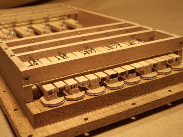 Oui. Je suis pourtant du genre tenace mais bon, quand quelque chose ne donne pas entièrement satisfaction, il faut arrêter de s'obstiner! Pourtant, tout fonctionne. Mais les réglages sont bien trop pointus pour qu'on puisse envisager de ne pas avoir à les reprendre trop souvent. Et ça c'est tout de même assez contraignant. Le principe est bon, la seule chose qui ne va pas c'est la dimension des boursettes circulaires. Avec 20 mm de diamètre, la force qu'elles procurent est bien trop faible. Et comme tout est affaire d'équilibre entre les différentes forces et les ressorts, la latitude de réglage (et donc de déréglage!) est extrèmement réduite. Il faudrait des boursettes de 34 mm de diamètre pour obtenir la même force qu'avec un mini-soufflet de 12 x 80 mm, et travailler dans un plage de réglages plus confortable. La pb, c'est qu'ensuite il faut les loger sur le sommier, et tout est affaire d'architecture de l'instrument. Mais comme j'étais parti pour faire tout petit, il n'y avait pas la place pour des boursettes circulaires de 34 mm. La solution retenue sera donc très différente... Voici tout de même le principe de fonctionnement: |