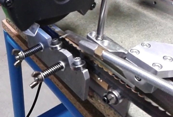 Bien évidemment la course du doigt d'avance de la lame est réglable (longueur effective du maneton) afin de l'ajuster au pas de la lame. Une mention particulière au dispositif de calage de la lame à affûter. Celle-ci coulisse dans une glissière en bronze sous la contrainte de deux roulements à bille montés en oblique. La lame est ainsi parfaitement maintenue et plaquée contre le fond de la glissière.