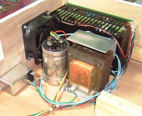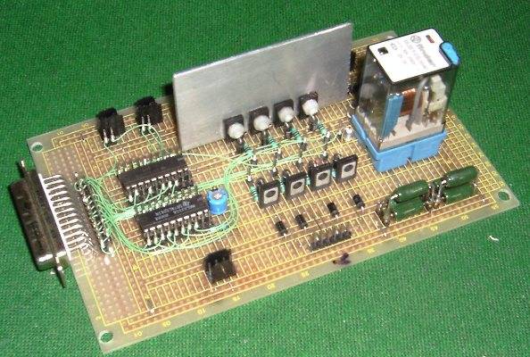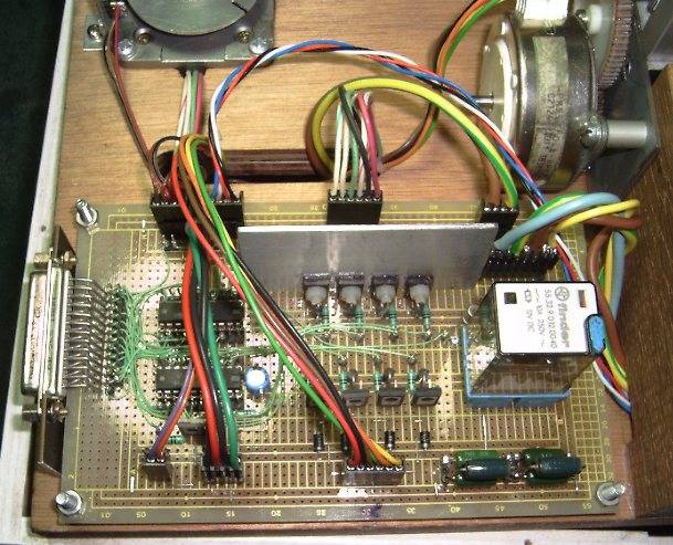 | De manière à résoudre les problèmes de parasitage des informations retournées vers le PC, le moteur de poinçon est alimenté par un transfo séparé. Redressement double alternance et gros condensateur de 47000 mF qui fait surtout office de tampon afin de fournir au moteur un fort courant au démarrage. L'intensité moyenne est de l'ordre de 10A, avec des pointes pouvant atteindre 20A dans du gros carton. Un bloc d'alimentation de récupération fournit par ailleurs 5V, 7.5V et 15V respectivement pour la logique, le moteur de tête et le moteur d'avance du carton. L'électronique de commande est simplissime. Elle comporte essentiellement un octuple buffer (74LS241, non inverseur) associé à des darlingtons (BD679) pour la commande des moteurs par le PC, ainsi qu'un second buffer (74LS240, inverseur) remontant vers le PC, les informations collectées par 4 switches optiques (poinçon haut, poinçon bas, capteur rotatif et capteur linéaire). Le relais de commande du moteur de poinçon est également commandé via ce second circuit, et comporte 2 contacts repos/travail de manière à gérer le frein électrique (switch dans la tête). Un second relais contrôle l'alimentation électrique du moteur de poinçon, et coupe celle-ci à la moindre anomalie afin d'éviter les effets "néfastes" d'un éventuel blocage de ce moteur... C'est tout! Montage sur une plaque d'essais avec un poil de wrapping ;o) Pour les curieux... Le "tas" de résistances de puissance en bas à droite de la carte, entre dans un montage dit "long tail" qui améliore les performances de démarrage des moteurs pas à pas. Ces résistances ne figurent pas sur le schéma, et ne concernent que le moteur X. Elles sont simplement en série dans le + de l'alimentation vers ce moteur et leur valeur équivalente est de 0.7 Ohms. |