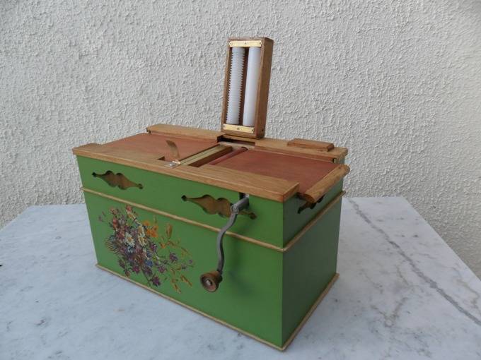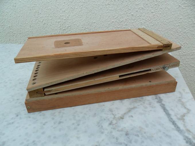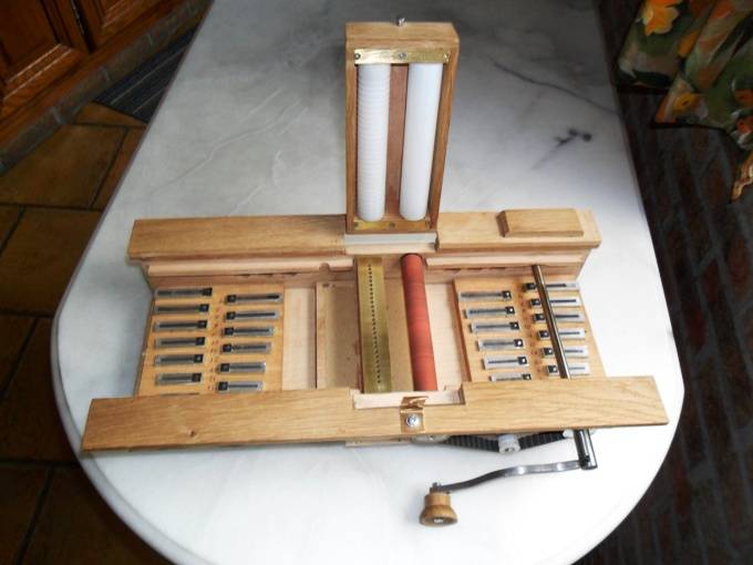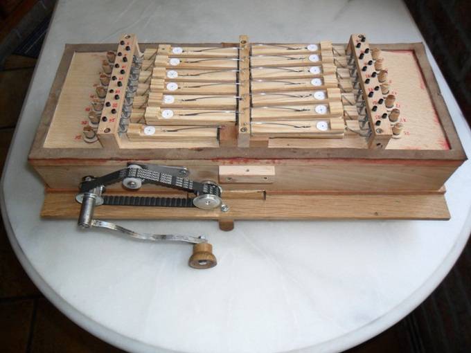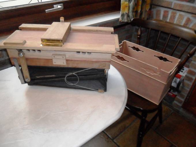Fortement inspiré de mon 29 à anches, Claude a réalisé ce 27 notes. En dépression donc. Les modifications qu'il a apportées sont très intéressantes, et permettent d'aboutir à un instrument des plus simples, à construire comme à régler. Mes pages sur le 29 à anches : ici Le soufflet Un seul soufflet double, et une réserve. Et ça suffit. En dépression, et surtout avec des anches, les petites variations de pressions sont quasiment imperceptibles. Réalisation toute simple Le sommier Dessous : Les petits soufflets, les vis de réglages de course, et les petits clapets ronds. C'est là qu'il y a le plus de travail, mais ce n'est pas si compliqué que ça en a l'air, car beaucoup de pièces sont identiques. Tout est là Dessus : Les anches, le presseur, la flûte de