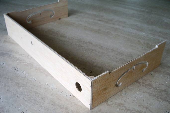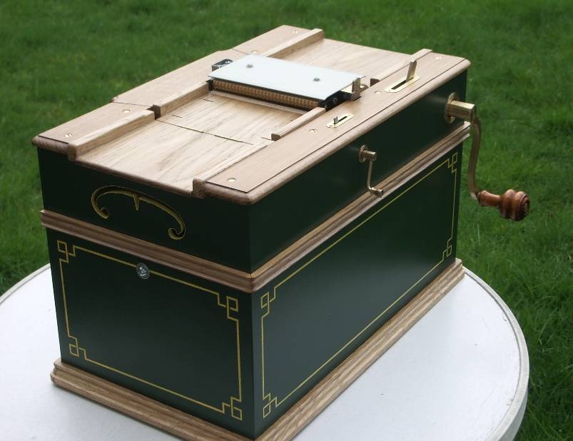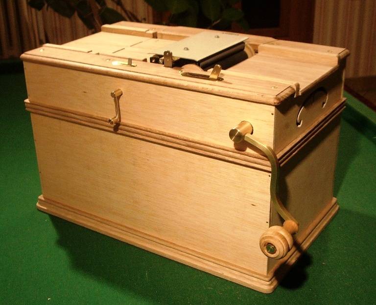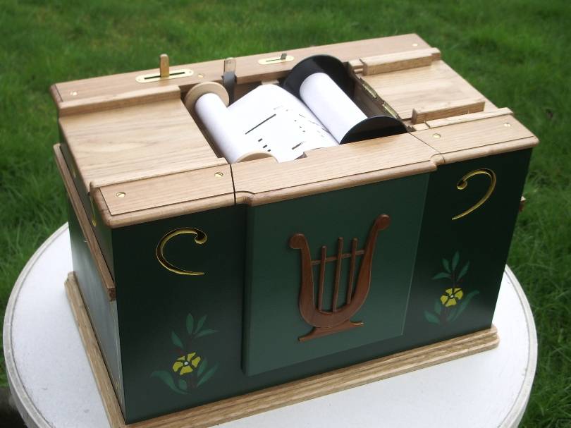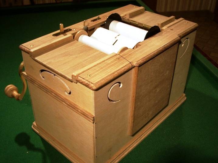 | Oui, dans ce cas on ne va tout de même pas parler de buffet! La principale difficulté est d'incorporer un chemin de carton dans un orgue à rouleau, et de faire en sorte que ce chemin puisse facilement laisser la place à la bobine. Le problème, c'est qu'il ne suffit pas de glisser la tablette, car la bobine est plus large que le carton. L'autre contrainte se situe au niveau du presseur : c'est quand-même pas plus mal s'il n'est pas là quand on n'en a pas besoin. Le coffret est en 2 parties : Une partie basse qui habille la soufflerie, surmontée d'une partie supérieure supportant le guidage du carton et abritant la mécanique. Tout ça à cause du passage de l'axe de la manivelle, et parce que je me suis mis en tête de faire tout petit!
