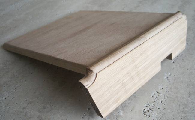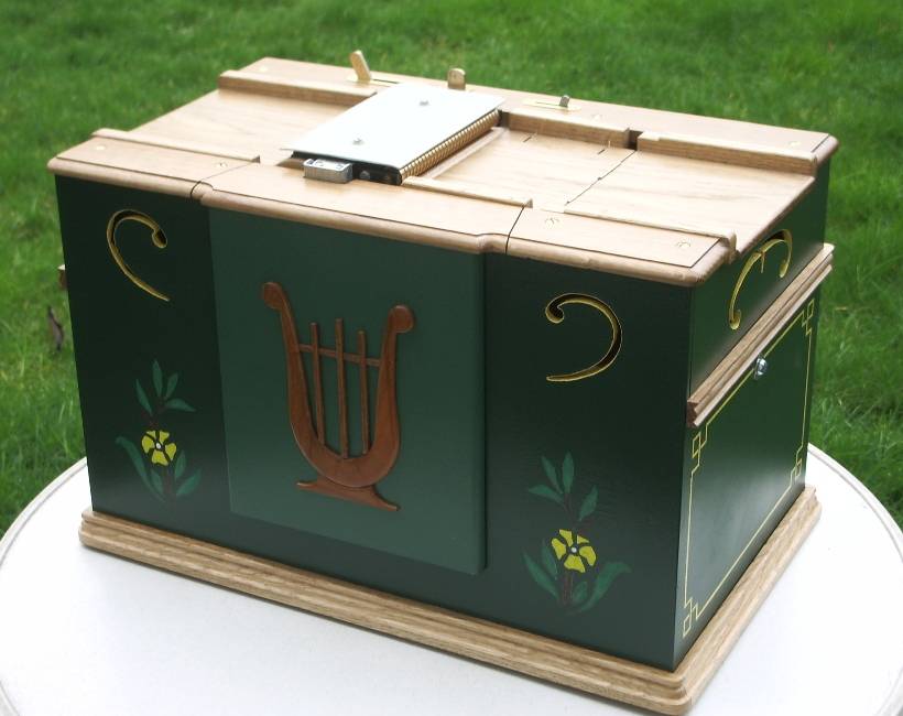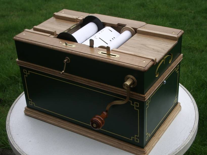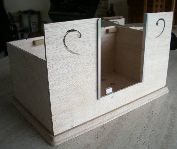 Un truc comme ça quoi... Le dessus Simplement composé de 2 planchettes latérales en chêne moulurées encadrant le chemin de carton proprement dit. Assemblage des éléments entre eux par fausses languettes de 3 mm et collage, puis découpe de la partie avant. Celle-ci ne sera solidarisée au volet qu'en dernier lieu, par collage, et quand tout sera en place par ailleurs. Vue de dessus Le volet Une planchette en contreplaqué de 3 mm d'épaisseur, et 2 profilés en quart de rond munis d'une rainure. C'était possible de faire bien plus simple en se servant des côtés du coffret comme glissière, mais il aurait fallut élargir la découpe dans le dessus de la boîte à vent... et ce jour là, j'ai eu la flemme! Le tasseau dans l'angle renforce le collage Assemblage La partie technique de l'instrument est posée sur les tasseaux de la partie basse du coffret. Ensuite on pose la ceinture, puis la partie haute. Enfin le chemin de carton coiffe le tout. Il est assemblé au mécanisme par des vis en laiton. Donc... tout est fixé, coinçé, et plus rien ne peut bouger. A la jonction entre les 2 parties, le profilé en chêne assure la double fonction d'assemblage et de décoration. Cette ligne "casse" un peu la hauteur de l'instrument et le rend plus harmonieux à regarder. Enfin, c'est ce que je me dis... Il aurait pu être collé sur la partie basse, mais il est amovible, essentiellement pour faciliter la décoration : il sera vernis alors que le reste sera peint. Le profilé est muni de pointes à tête large qui sont coincées entre le haut et le bas du coffret A la base un autre profil aux angles arrondis, assure la finition et le renforcement du coffret. L'arrière en mode carton, et l'avant en mode rouleau Les dimensions : 40x24x26 cm (un peu moins gros qu'un Seraphone). Le poids : tout juste 7 kg... quand-même ! (Y'a beaucoup de chêne).