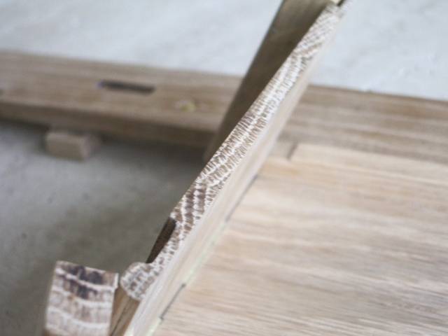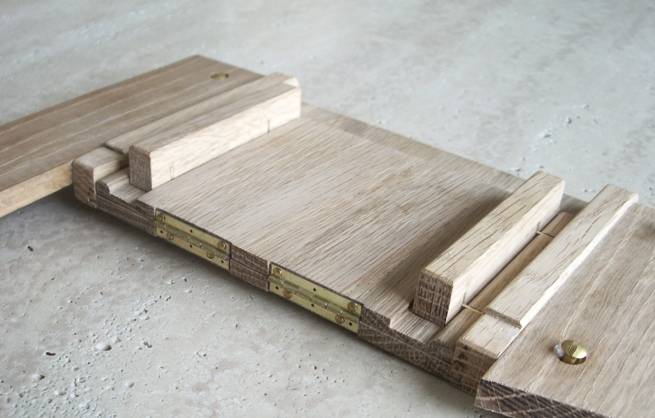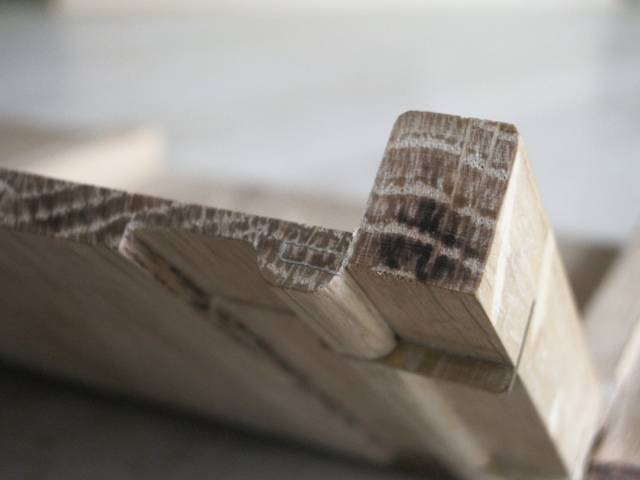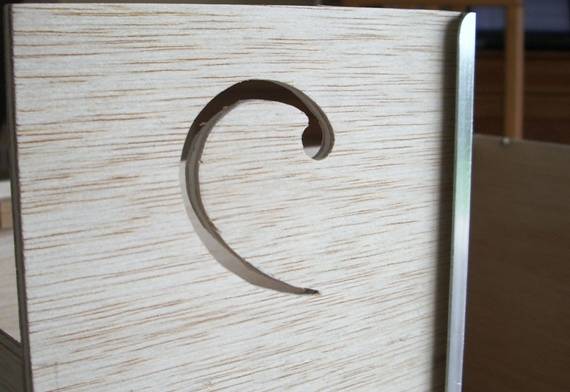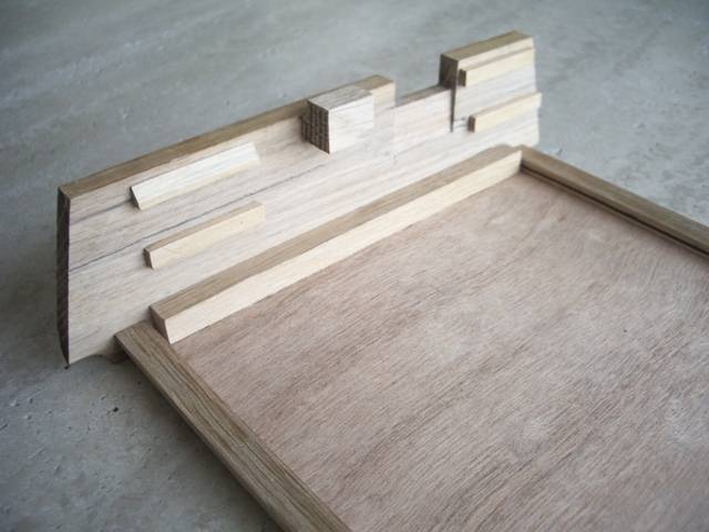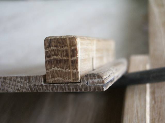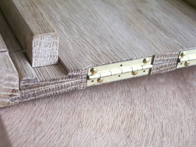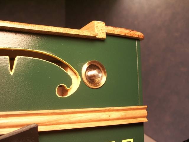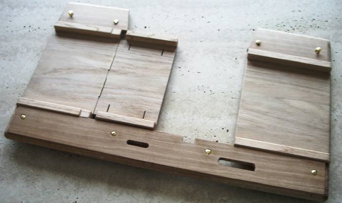La partie basse Tout simple : une boîte en contre-plaqué de 5 mm assemblée par collage et pointes. L'orgue repose au niveau du sommier, sur 4 tasseaux collés contre les parois internes de cette boîte. L'avant est plus haut que les 3 autres côtés. Cette face est munie d'un volet coulissant qui abrite le presseur. L'avant de la partie basse avec les glissières du volet de presseur La partie supérieure Une simple demi-ceinture en forme de C, toujours du même contre-plaqué, et qui vient simplement se poser sur la partie basse. Le plus long... ce sont les découpes Les ouies Elles sont découpées en face des blocs qui portent les anches, et sont très importantes pour laisser passer le son. En effet, si ça se passe à peu près bien avec un rouleau, ce n'est plus la même chose avec un carton, car celui-ci ferme alors complètement le dessus de l'instrument. Et comme y'a pas de raisons que ça sonne différemment dans un cas ou dans l'autre, il a fallut "faire des trous". Bon, leur importance n'a rien à voir avec celle des ouies d'un violon hein! Mais quand-même, elles doivent être d'une taille suffisante. Et puis de manière assez marginale, elles contribuent à arrondir un peu le son. C'est toujours ça de pris! Et puis au moins, ça permet de se servir de la scie à chantourner! Le chemin de carton Là, je me suis un petit peu compliqué la vie. L'idée, c'était qu'il n'y ait aucune pièce "volante", et que tout s'escamote et se replie. C'est comme ça que je suis arrivé à cette tablette qui prolonge le guide jusqu'à la flûte de pan en mode carton, et qui se replie sur la table d'entrée en mode rouleau. Le tablette repliable dans ses 2 positions Cette tablette est munie de guides latéraux qui passent alternativement dessous, ou sur les côtés. Dans le principe, rien de plus simple, et ça se dessine en 5 minutes. Mais la réalisation est une autre paire de manches! Non pas que ce soit compliqué, ni qu'il faille faire la chasse à des fournitures difficiles à trouver : Les charnières latérales sont des plaquettes en laiton de 1 mm articulées sur un tronçon de corde à piano de 1.5 mm collé à l'Araldite au fond d'une rainure. Mais il faut travailler avec beaucoup de précision, et donner le bon profil à la planchette dans la zône de l'articulation. Là je n'ai pas trouvé d'autre solution que d'y aller très progressivement. Finalement ça fonctionne plutôt bien, et quand le guide est en place il joue parfaitement son rôle. Gâ...gné! Guide latéral, dessus et sur le côté Les toutes petites charnières "piano" sont des 10x30, et se trouvent en magasin de modélisme (chez Casto, y'en a pô !... et chez les autres non plus). Casse-tête que de bien positionner ces toutes petites charnières Les planchettes : Elles sont en chêne massif, et ne mesurent que 5 mm d'épaisseur. Pour qu'elles ne se déforment pas trop, on fabrique une sorte de "latté" dans lequel les contraintes sont sensées s'annuler. On part d'une seule planche de 35 cm de long, 15 cm de large, et rabotée à 5.5 mm d'épaisseur. En l'état, elle ne demande qu'à se tortiller dans tous les sens, au gré de l'hygrométrie ambiante. Alors, elle est refendue en bandes de 15 mm de large environ. Ensuite, ces bandes sont ré-assemblées par collage, chant contre chant, mais en prenant bien soin de retourner une bande sur deux: bout pour bout, dessus pour dessous. Des serre-joints, et tout ce qu'il faut pour que ce soit collé bien à plat, puis on laisse tranquillement sécher. Ensuite, un léger coup de raboteuse pour ramener la planche à la bonne cote, et on obtient quelque chose qui se tient bien droit. Apparemment, ça ne cintre pas trop Après coup ! .... Ben oui, c'est toujours après qu'on a des bonnes idées! Ca aurait été infiniment plus simple avec une tablette d'entrée coulissante qui emmène ses bords avec elle, et dont une partie se rabat sur le côté de l'orgue. La prochaine fois... ;o)