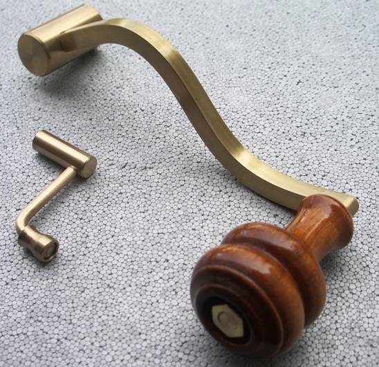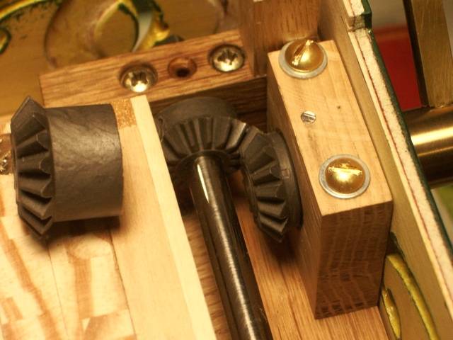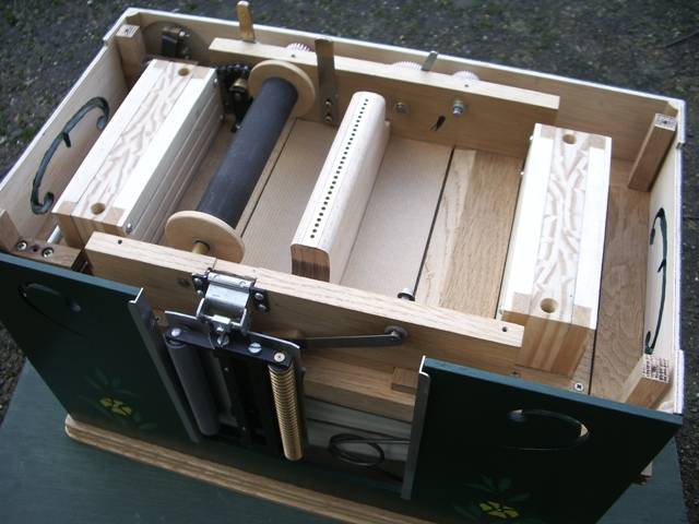 Les manivelles Fabrication maison, et intégralement en laiton comme sur le premier orgue. Rien de spécial à dire si ce n'est qu'elles sont légèrement vernies à la bombe pour éviter la corrosion du métal, et... que je ne sais toujours pas dans quel sens ça se tord! La grande et la petite... Tout ce qui est en chêne est vernit. Le reste est peint, de la même couleur que l'orgue à flûtes, et avec des similitudes de décor. La lyre sur le volet avant est découpée dans une planchette en cerisier de 2 mm d'épaisseur. Enfin, quelques plaquette en laiton habillent les ouvertures des différentes manivelles et leviers. Un dernier coup d'oeil à la mécanique avant de fermer Je n'ai pas encore le cuir pour la bandoulière, mais on va quand-même dire que c'est finit ! En mode carton, vue de derrière, et vue de devant Même chose en mode rouleau A l'usage, lorsque l'on porte l'instrument en bandoulière (il a tout de même été un peu fait pour ça !), la manivelle contre soi est un peu mal commode à utiliser. Comme il y avait juste la place, j'ai installé un renvoi d'angle pour pouvoir la monter sur le côté. Les engrenages viennent de chez HPC Europe. Il a fallut retravailler un peu les engrenages pour que ça passe Le palier est constitué de 2 roulements de rollers côte à côte. Le premier côté pignon est claveté dessus et dessous. Le pignons eux-même sont également clavetés dans les arbres de 8 avec des queues de forêt de 2.5 mm. Voilà ! Pour apprécier comment ça marche, rendez-vous cet été...