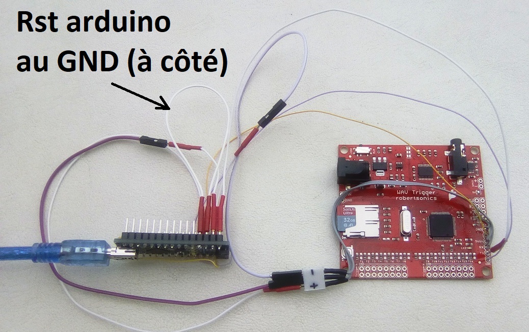 - Câbler 5Vin, Rx et GND de la Wav trigger sur un connecteur 3 points vers le
