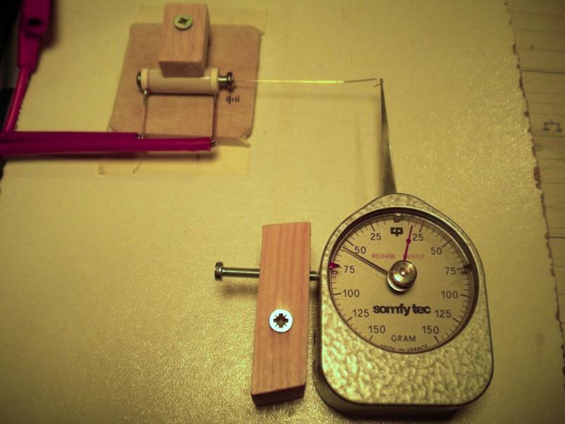 initiale. Remarque : Je ne fais pas travailler le dynamomètre dans la zône où il est le plus précis. Ok. J'en ai un autre plus sensible (max 25g), mais le déplacement du palpeur est alors beaucoup plus important pour les forces que l'on mesure. Du coup ça devient complètement ingérable parce que justement, on veut des petits déplacements pour ne pas fausser les conditions de mesure. Ceci étant... La mesure effectuée ici est parfaitement répétitive, et l'erreur, si erreur il y a, n'est sans doute pas d'un facteur 10. Et puis si c'était le cas, ben avec 0.016 N on aurait encore assez ! Donc, même si la formulation est propre à faire bondir les physiciens, je