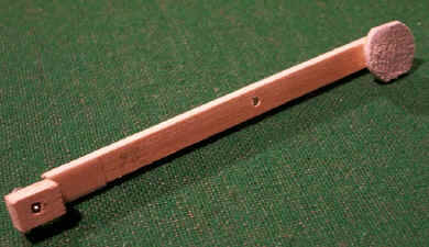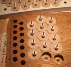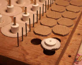 Savez-vous planter les clous, à la mode à la mode... Pose des vergettes Il s'agit simplement de bien les aligner pour qu'elles ne se "marchent pas dessus" et qu'elles battent bien librement entre leurs guides. Pose des clapets Les clapets sont tirés d'une planchette de contre plaqué de 1 mm, garnie de peau d'un côté, et d'une feuille de kraft de l'autre pour éviter toute déformation. Ils sont reliés aux vergettes, alors que celles-ci sont en place. Une petite pièce en peuplier effectue la liaison. La difficulté est de bien centrer le clapet sur son siège. Opération quasi-impossible en aveugle. Astuce: une rondelle légèrement plus petite que 10 mm (oui, encore le tour...) est temporairement fixée au centre du clapet avec une toute petite boulette de "Patafix". Qui s'avèrera ensuite, trèèès difficile à décoller du cuir (encore une bonne idée tiens!). La pièce de centrage Pour terminer l'opération vergettes, et avant le dernier remontage, elles seront graphitées à l'aide d'un crayon gras à l'endroit où elles peuvent frotter contre les pointes d'alignement (j'ai vu ça sur de vrais instruments ;o)).