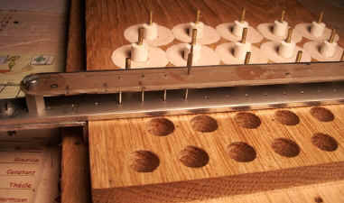 Le guidage des vergettes Il est effectué par des pointes sans tête en acier (pointes à moulures), de 0.9 mm, plantées bien verticalement tous les 8.4 mm. Facile hein? Non! Carrément impossible à main levée dans du chêne dont les fibres n'est font qu'à leur tête pour faire dévier les pointes. Un début de solution: Fabriquer un gabarit de pose. Deux chutes que j'avais sous la main (époxy à circuit imprimé et alu) collées l'une sur l'autre à la cyano et percées simultanément de trous de 1 mm espacés de 8.4 mm. On sépare les plaquettes, on assemble le guide, et on plante quelques clous dans une planche d'essais. Logiquement, ça devrait nous donner des pointes parallèles non? Raté! Guide enlevé, on constate que si les pointes sont bien équidistantes à leur base, elles partent tout de même de travers, et sont loin d'être verticales et bien parallèles. Alors on les redresse? Pas possible... Ces pointes sont en acier très dur et cassent comme du verre. A moins peut-être de les détremper... Un coup de chalumeau (avant pose hein) et hop, on peut les redresser. Non mais! Hélas, un fois détrempées, les pointes s'écrasent sous les coups de marteau, et il devient impossible de retirer le guide! On pourrait couper le petite bosse qui s'est formée, mais ça produit une aspérité pas très esthétique... Alors?... Alors on va procéder en 2 temps: Plantage de pointes trempées, qui partiront de travers, mais qui seront arrachées, pour être remplacées par des pointes détrempées. Comme les trous sont déjà fait par les pointes précédentes (vous suivez?) ces dernières s'écrasent beaucoup moins, et on peut retirer le guide. Ensuite, il suffit de parfaire l'alignement à l'aide d'une petite pince plate. Ouf! Quelle histoire, pour 31 malheureuses pointes!... :o))