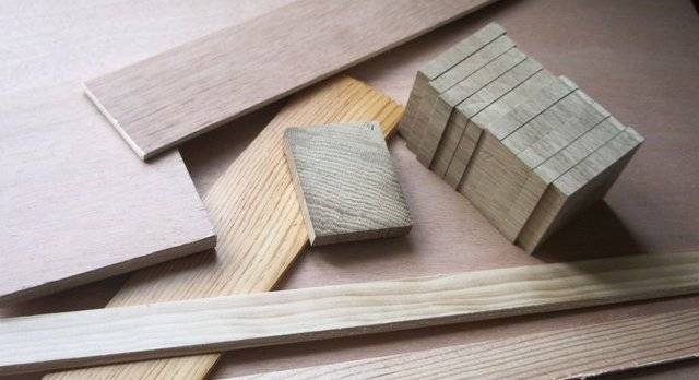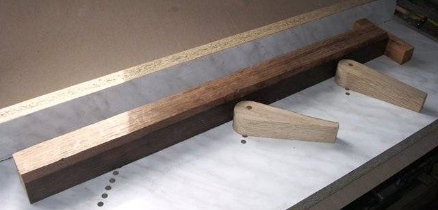 Les matériaux de base : Des planchettes de pin à lambris rabotées à 4 mm, du chêne "en tranches" de 10 à 12 mm d'épaisseur tirées d'un beau bastaing, et du contre-plaqué en 5 et 10 mm d'épaisseur. Il y a assez de tranches de chêne pour faire un jeu complet Le banc de montage : Chacun