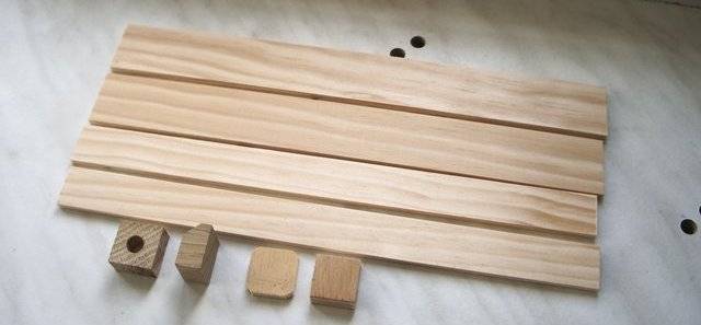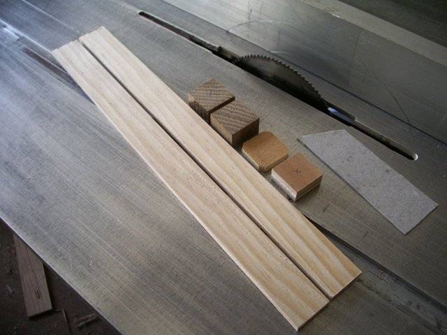 Découpe des éléments : On suppose que le pin est déjà raboté à 4 mm. On règle le guide parallèle de la scie circulaire à 20 mm. Oui un mètre est bien assez précis dans ce cas... On ne construit pas un moteur de formule 1 ;o) Contre le guide ainsi réglé, on découpe successivement : Et voilà. Tiens? Il y a un morceau en plus (marqué d'une croix) et un bout