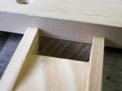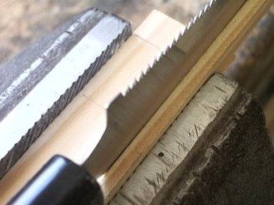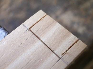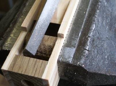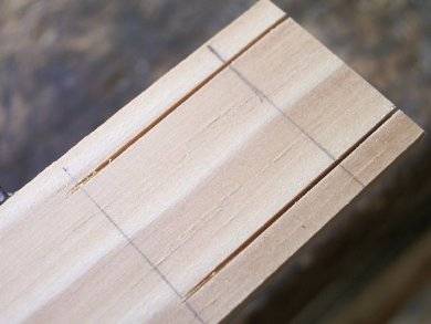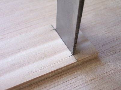 et d'autre du premier trait, de manière à délimiter la largeur de bouche. Cette fente doit être nette, effectuée d'un seul geste si possible sans reprise, et pas trop profonde (1 mm max). Il est prudent de faire quelques essais sur des chutes pour se faire la main. Retourner à nouveau la planchette, et la fixer dans les mors