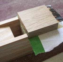 dessus en y allant par passes minces et en commençant contre les traits de scie. Crac! Ca s'ouvre. C'est t'y pas biau? Note importante : Il ne faut pas tailler l'extrémité en couteau, mais au contraire laisser une "certaine épaisseur", de l'ordre de celle de la lame d'air. Pour terminer, il reste à ajuster la hauteur de bouche à la cote exacte à l'aide du lapidaire (voir la jolie photo floue). Faut pas laisser le pied à coulisse quand le disque tourne hein ;o) Eh ben ça doit en prendre du temps me direz-vous? Non non, pas tant que ça. Quand on est bien habitué, on taille un bouche en guère plus de 5 mn. Il faut s'entraîner, s'entraîner encore, et bien apprendre à sentir le sens des fibres du bois pour tailler la bouche du côté où elle se taille presque toute seule (il n'y a que 2 possibilités ;o)). Ce ne sont pas les innombrables chutes qui manquent dans un atelier... Et puis ça fait du bien de temps en temps, de travailler en silence, en dehors du boucan des moteurs et des machines ! Pendant ce temps là, le reste du tuyau a séché... Collage de la face avant Bien poncer le dessus de la flûte auparavant de manière à mettre tous les éléments dans le même plan. Ensuite, il faut juste faire attention à aligner le haut du bloc de pied, et le bas des oreilles de la bouche.