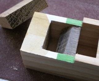 Pendant que ça sèche tranquillement, on va fabriquer la bouche. Et puis tant qu'à faire, on va se faire une bouche à l'ancienne, et carrément à la main siouplait. Yo! Comment tailler une bouche "à oreilles" (ou à joues, ou à c'que vous voulez...) : La planchette est bien d'équerre, et on commence par reporter