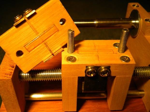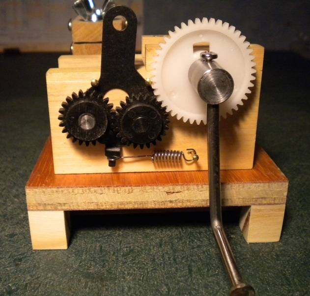 Bien sûr, avec un tour à métaux ça se fait bien. Et puis d'ailleurs, la bidouille à base d'une tige filetée que j'utilisais jusqu'à présent produit aussi des ressorts tout à fait convenables. L'idée c'est d'obtenir plus facilement des ressorts un peu mieux finis, avec des spires jointives à chaque extrémité. Ca ne changera rien au fonctionnement des soupapes, mais les ressorts seront encore plus jolis à regarder ;o) Principe Concevoir une petite machine autonome, une sorte de tour manuel, exactement adaptée au boulot à faire. Le fil s'enroule sur un mandrin entrainé par une manivelle pendant qu'un trainard embrayable et débrayable à volonté, le fait avancer quand il faut, et avec le pas qu'il faut. Simple non ? La machine terminée La base est en ctp de 10 mm et mesure 150 mm x 100 mm. Toute la construction est réalisée en ramin de 9 mm (chutes de plinthe). La broche est en acier de 8 mm et tourne sur des paliers bois. Elle est décolleté à 6.5 mm sur les 40 mm de la partie "mandrin de ressort" proprement dite. Comme ça quand on relache le ressort, son diamètre intérieur est de 10 mm. L'axe de la broche est à 40 mm de la base, et la partie paliers mesure également 40 mm de large (mon réglet est recouvert de givre après 40... :o)). La vis-mère, c'est de la tige filetée de 8 mm, décolletée à 6 mm aux extrémités et elle tourne sur des paliers en nylon insérés à force dans le bois. La hauteur de son axe : C'est "juste ce qu'il faut" pour que le fil sorte tangentiellement au mandrin d'enroulage. La base est montée sur 4 pieds de 15 mm laissant la place à une bride qui permet de fixer la machine sur une table au moyen d'une presse. Et un ressort, un ! Entraînement et broche Le