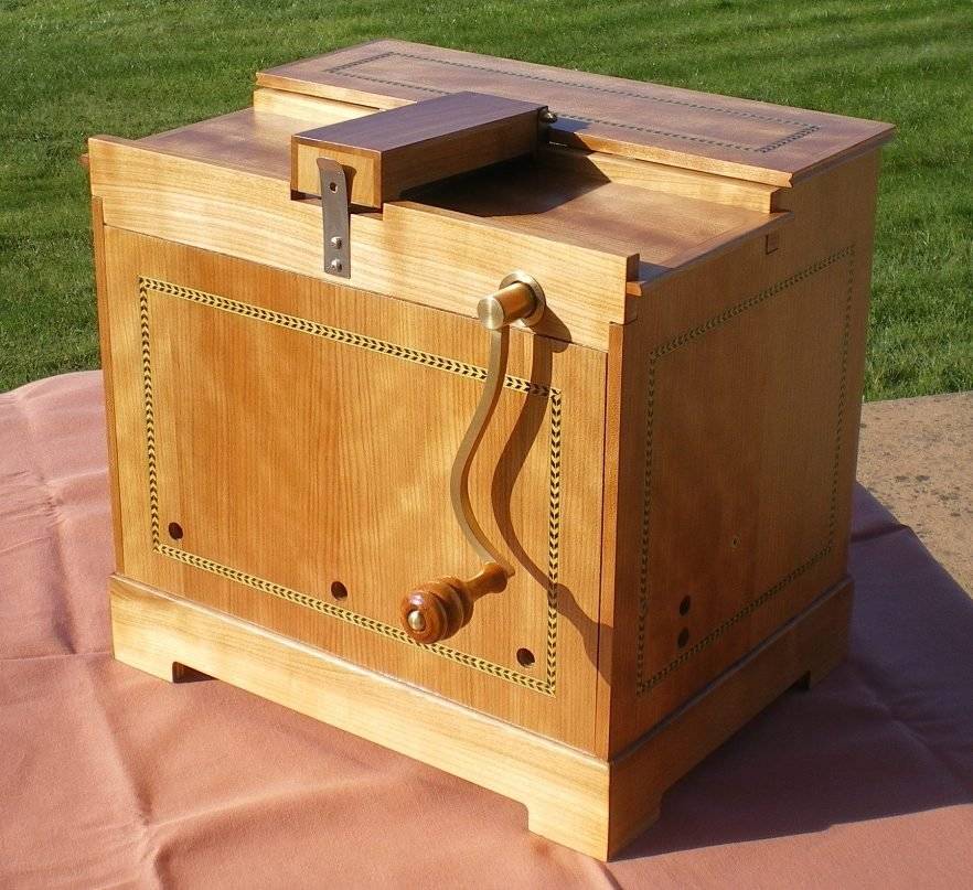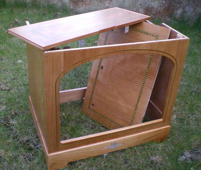 J'avais promis de changer un peu. De toutes façons j'suis coincé, ils ne la font plus ma peinture verte. ;o) Préparation Le coffret est complètement plaqué avec du merisier, souligné de quelques filets de marqueterie incrustés (Maréchaux SA). La ceinture du bas c'est de la planchette en merisier de 4 mm, incrustée à l'avant d'une inévitable rose des vents, en nacre cette fois. Même que la nacre a été tirée de coquilles d'ormeaux pêchés par bibi. Si ! Ensuite, raclage, ponçage, et très légère teinte pour égaliser. On termine la préparation par un bouche-pores et un poncage très fin au 240. Finition Il y a quand-même un peu de vert. Ouf ! ;o) Bon... C'est comment alors ? Montage Et puis bien sûr, les tablettes du chemin de carton, celle du dessus, ainsi que le panneau arrière se montent et se démontent sans outil pour pouvoir montrer très facilement comment c'est fait ;o) Cliquer l'image pour lancer le diaporama du montage (3.5 Mo) Et voilà... Au bout de 500 heures de travail (au moins), après avoir confectionné 1006 pièces essentiellement de bois mais aussi de cuir et de métal (je les ai comptées ;o)), et les avoir assemblées au moyen de diverses colles et de près de 120 éléments de visserie... ...cet instrument est lui aussi terminé. Ca me fait toujours un petit pincement au coeur quand ça s'arrête, et c'est pour ça que je n'en finis pas de finir pour prolonger le plaisir. La conception/réalisation de A à Z d'un tel engin, c'est à sa manière une petite histoire sentimentale, ponctuée de rendez-vous quasi-quotidiens avec lui pendant près d'un an et demi. En tous cas, je me suis drôlement bien amusé ! Et même si cette fois-ci, ça m'aura coûté un bout de doigt, le bilan global c'est une immense dose de bonheur. A tous ceux qui hésitent encore, je ne saurais que trop répéter : Foncez. Construisez votre instrument, vous ne le regretterez pas. Ce n'est pas forcément facile de faire aussi petit, mais en se donnant éventuellement un peu d'aise, avec un minimum d'adresse et une bonne dose de ténacité, on peut y arriver ! Et puis, avant de tirer le trait réglementaire...