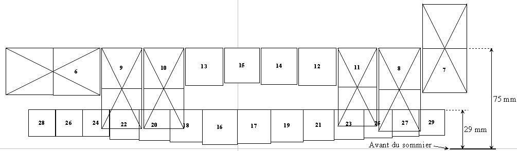 Des flûtes rectangulaires auraient peut-être pris moins de place. Encore que... Si on veut une section à peu près identique, ce que l'on gagne en largeur, on le perd en profondeur. Alors, elles seront carrée pour la simplicité de réalisation. Le diapason va d'une section de 11 mm pour les aigues, jusqu'à 40 mm pour les graves et n'est pas linéaire. Cliquer sur l'image pour télécharger le tableau de cotes La construction des tuyaux a été effectuée selon le procédé qui est détaillée ici. Dès que les flûtes parlent, elles sont sommairement accordées. Ensuite elles sont coudées si besoin, puis harmonisées. Les arrivées d'air sont suivant les cas, en bas, derrière ou sur le côté du pied. Les 4 groupes de flûtes une fois coudées Disposition et coudage définitif des flûtes Remarque 1 : Sur le montage final de l'orgue, la rangée avant de flûtes est surélevée par un pied tourné d'une hauteur de 30 mm. Ce n'est pas seulement pour faire joli, mais absolument indispensable ! Faute de quoi, la rangée arrière est impossible à accorder du fait de la trop grande proximité des flûtes de devant. Faut que ça "respire" quoi. :o) Remarque 2 : J'ai essayé de faire en sorte que ces flûtes fonctionnent avec le moins possible d'air. Les épaisseurs des lames d'air qui sont dans le tableau ne sont qu'indicatives, et la plupart du temps il faut bien moins que cela. Le pb c'est de s'arrêter juste à temps, quand le volume sonore n'augmente plus. Car ensuite, toutes sortes de bruit indésirables commencent à se manifester, et la consommation d'air augmente. |