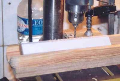 Réalisation La technique mise en oeuvre est analogue à celle utilisée pour le rouleau presseur: marquage précis et travail progressif. Le marquage est également effectué à l'aide d'un gabarit dessiné au moyen d'un outil de dessin informatique. Le gabarit est cette fois-ci collé sur un beau tasseau de bois à grain fin (hêtre, merisier...), et ne sera enlevé qu'à la fin du travail par ponçage. Afin de ne pas "perdre le centre", les trous sont percés en 2 étapes : 0.8 mm avec un forêt à circuit imprimé (ou un forêt à centrer), puis 3 mm avec un forêt à bois. Il est bien sûr indispensable de confectionner des gabarits de guidage afin d'assurer un parallélisme parfait de tous ces trous. Perçage dessus, et... dessous