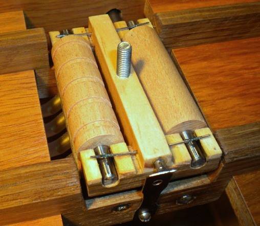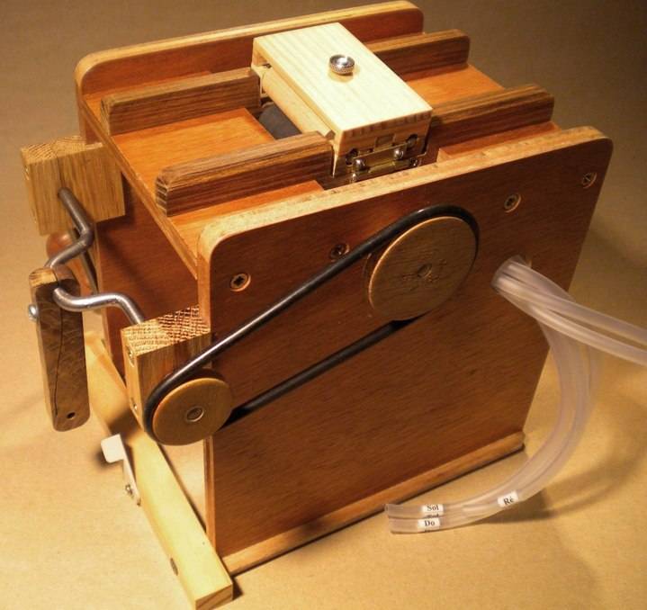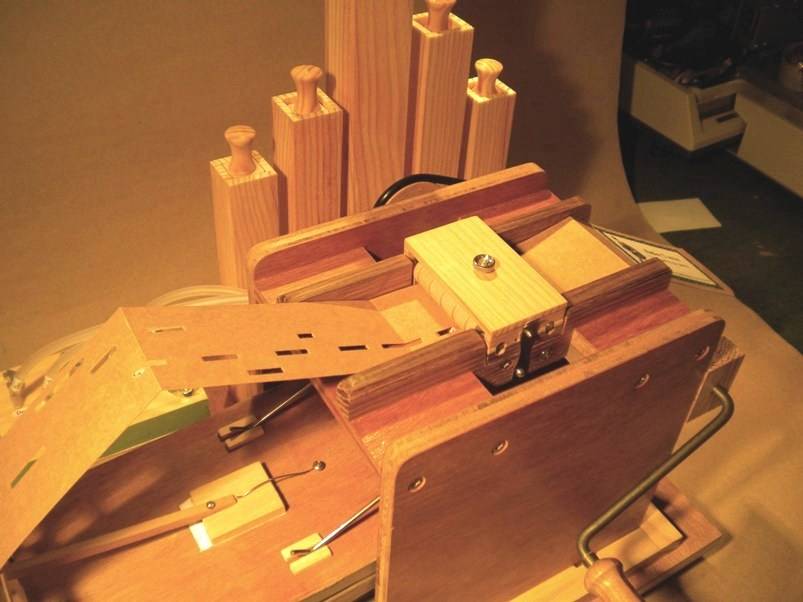 fin octobre 2010. A vous de jouer ! Si vous construisez cet orgue, envoyez-moi des photos. En retour, je vous ferai parvenir quelques bouts de carton perforé pour le faire chanter. Et puis si vous faites un "arrangement" génial en 5 notes, je suis également preneur du midi. - La base fait 300 x 400 mm, en ctp de 14 mm. - Le bras de manivelle fait 100 mm de long. - Les 2 poulies font 30 et 45 mm de diamètre. - Le rouleau d'entrainement mesure 20 mm recouvert de son morceau de chambre à air. - Les rouleaux presseur font 16 mm de diamètre et le presseur complet 40 mm de large. - Chemin de carton de 50 mm. Premier trou à 5 mm et un trou tous les 10 mm. - Tous les tubes cuivre (sièges de soupapes et arrivées de flûtes) font 10 mm de diamètre extérieur. - Les soupapes : chambres de diamètre 25 mm, profondeur 10 mm, ressort aux environs de 15 g, baudruche et rondelles de carton + peau. Voir également la version de Jean-Pierre : ici