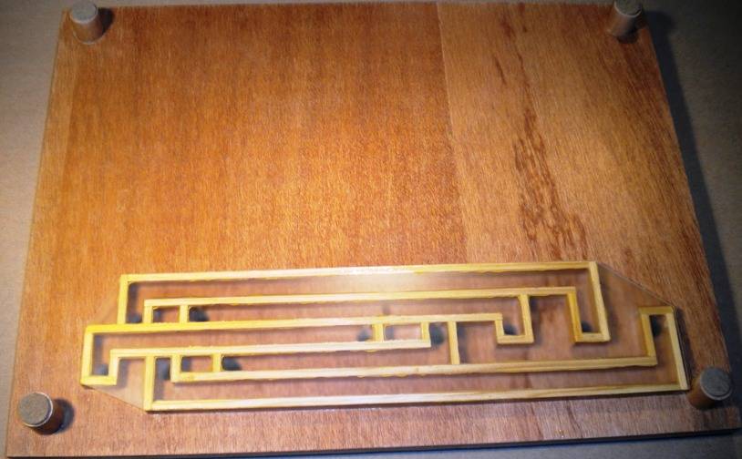 Les gravures sont rapportées dessous, et recouvertes d'un plexi collé pour mieux les voir. Autrement de l'autre côté, les tasseaux rainurés et les divers pitons, ben, c'est justement ça qui permet l'assemblage éclair. Le plexi est collé à l'Araldite Le montage en vidéo (désolé pour la qualité du son) :