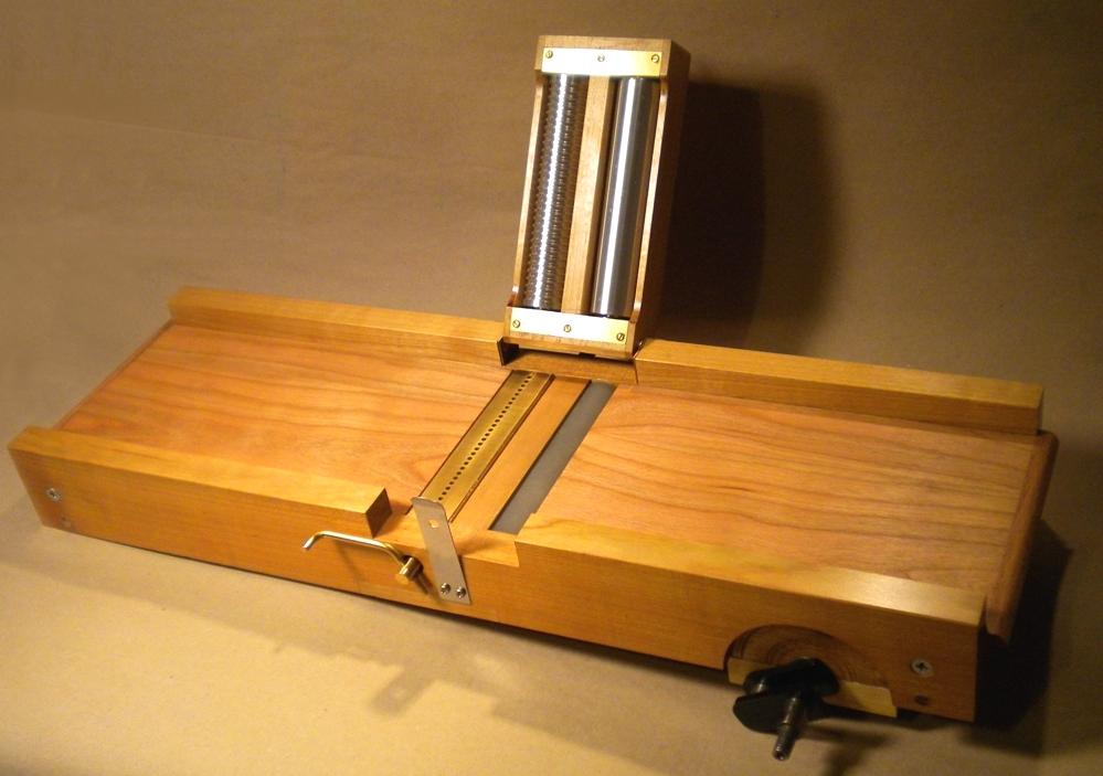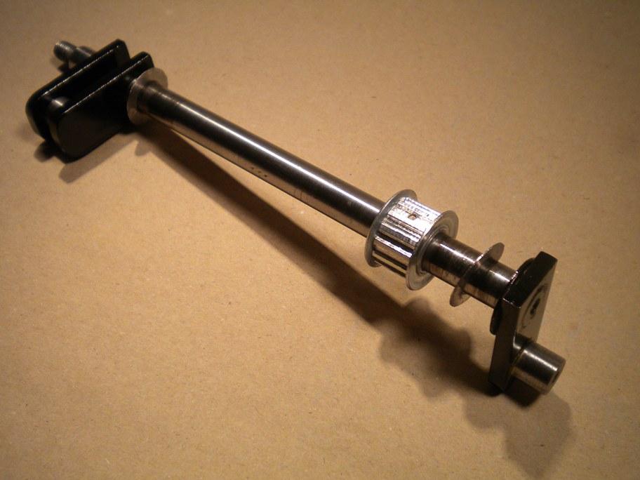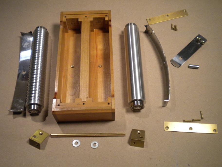 toujours fait comme ça et le carton va droit tout seul. Oui, la manivelle est en porte-à-faux sur le maneton d'extrémité, et ce n'est pas bien gênant à l'usage. Il y a une petite flexion bien sûr, mais la force qu'on exerce à ce niveau est bien inférieure à ce qu'il faudrait pour tordre durablement le métal. D'autant que du fait de la rotation, l'application de toute force dans une direction est suivie immédiatement et pendant le même temps, de l'application d'une force identique dans la direction opposée. C'est déjà comme ça sur mon orgue à anches cartons et rouleaux, c'est pareil sur les Organina Thibouville depuis toujours, de même que chez les facteurs d'aujourd'hui qui se sont inspirés de Thibouville. Alors, zen. Poulie et rondelles sont mis en place avant soudure Le presseur est très semblable à ceux de mes précédentes réalisations, l'objectif principal étant de faire compact. Le diamètre des rouleaux est de 25 mm. Les ressort sont des bouts de lame de couteau à enduire en inox de 6/10, et d'une largeur de 18 mm. Sur le rouleau cannelé c'est une simple lame, tandis qu'elle est doublée pour apporter plus de pression sur le rouleau d'avance. Comme sur mon premier 29 quoi. Verrou habituel au moyen d'une lame sur un téton et charnière maison bien sûr, permettant un dégagement complet du chemin de carton. C'est tellement plus commode pour mettre les carton en place, ou toute autre chose. La totalité des éléments du presseur et le