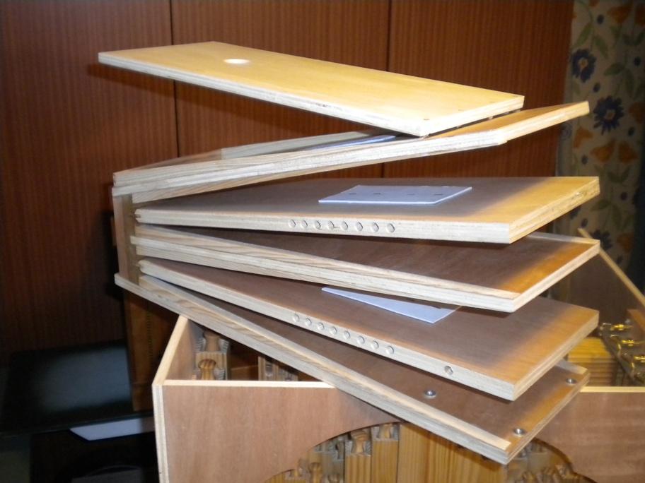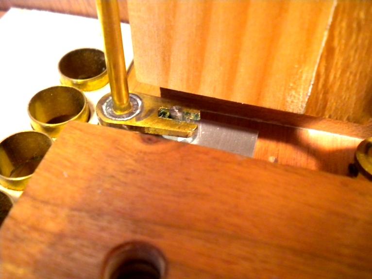 Habituellement, sur les orgues d'origine germanique, les commandes de registres sont situées sur le côté gauche au niveau du sommier et on actionne directement les réglettes. Avec un orgue qui passe des cartons, il suffit de faire l'exercice d'essayer d'atteindre ce point pendant que l'on tourne pour se rendre compte que ce n'est pas très commode, et que le carton côté débiteur constitue un obstacle à cette opération. C'est pourquoi j'ai déporté ces commandes en haut de ce même côté. La solution retenue vaut ce qu'elle vaut et j'en avais également envisagé d'autres. Celle-ci est assez discrète, et permet de placer 5 commandes dans un espace réduit, tout en gardant de la place pour loger encore 3 tuyaux derrière. Oui je sais c'est chaud, mais ça passe. C'est entièrement démontable bien sûr, et suffisamment accessible pour l'accord des tuyaux. Toutes les pièces en laiton sont fabriquées maison Les commandes sont de boutons de tiroirs en zamac, ré-usinés de manière à y aménager un logement pour les étiquettes circulaire d'identification des jeux.