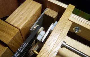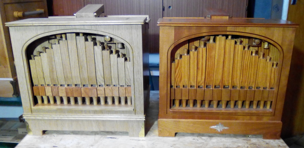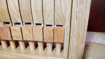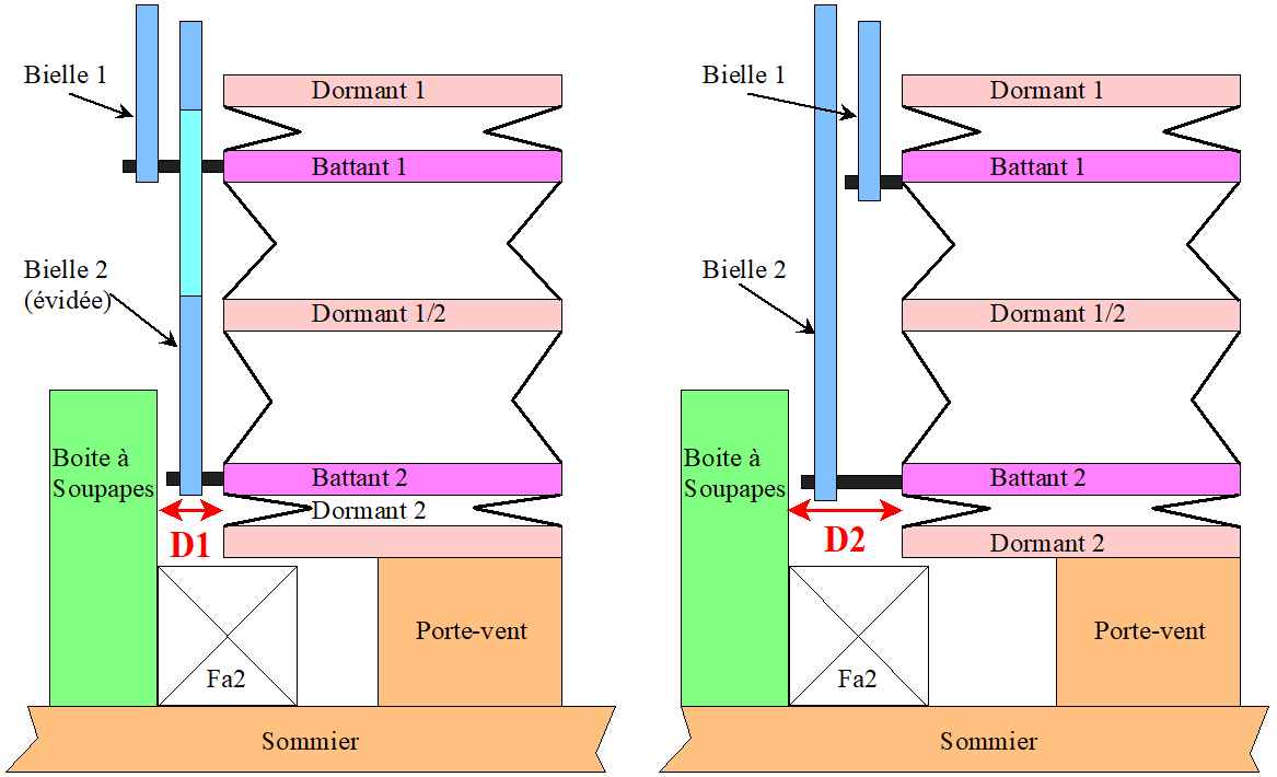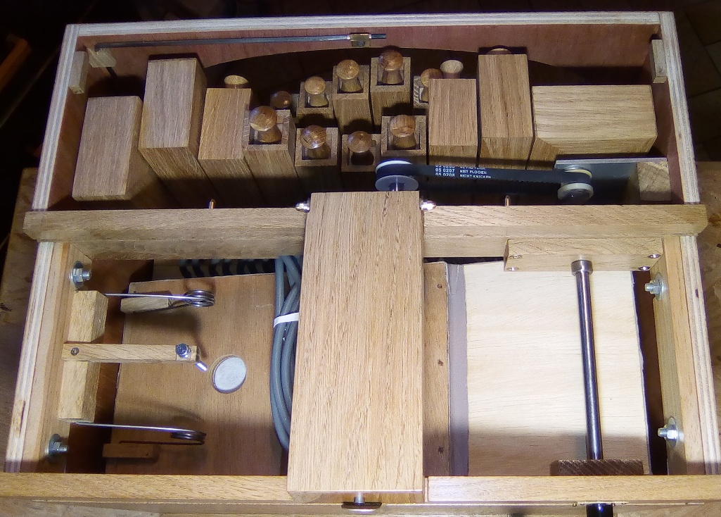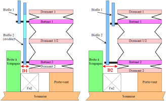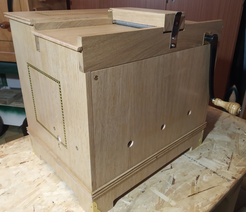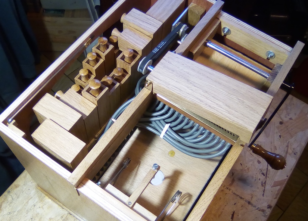 accordé initialement au débattement de la réserve. Les cousins Vue du dessus Rien de particulier. C'est juste pour montrer que rien n'a changé. Tout est disposé de la même manière et toutes les pièces sont aux mêmes dimensions. Nan, l'avant n'est pas cintré Les tuyaux C'est le même diapason que pour le premier, à l'exception des hauteurs de bouches. Elles ont été ajustées manuellement, tuyau par tuyau et à l'oreille, de manière à obtenir le son que je cherchais. C'est la raison pour laquelle je n'ai pas fait de bouche à joues. Finalement, toutes les bouches ont été abaissées et dans une assez forte proportion pour les basses. De ce fait, dans l'ensemble on obtient des attaques plus franches et des basses un peu plus puissantes. C'était le but... Voici le diapason mesuré sur les tuyaux terminés. Les lames d'air ne sont pas indiquées. Elles sont aussi fines que possible et ont également été déterminées à l'oreille, comme je fais habituellement. Par exemple, les passages d'air des 6 notes les plus aigues sont à moins de 2/10 mm et la plus grosse basse, le Do2 est à tout juste 5/10. Mais si, mais si et l'instrument sonne bien assez fort pour le chanteur ou la chanteuse qui sont derrière. ;o) Les blocs sont en merisier L'entrainement Cette nouvelle disposition plus simple a été rendue possible dans le même espace grâce à l'usage de matériel de récupération "qui allait bien" : Poulies crantées et roulement à billes de faible épaisseur (4 mm). A titre indicatif, il y a 18 dents côté vilebrequin et 24 sur le rouleau d'entrainement et la courroie vient de chez 123 courroies. Quant à la longueur de celle-ci... ben c'est "juste ce qu'il faut" pour que l'ensemble flûte de pan / rouleau se situe vers le milieu du chemin de carton. Bon allez, je le dis : 276 mm en module 3 ;o) Ceci étant, chacun fait ce qu'il veut à ce niveau. On peut imaginer une autre démultiplication qui fera tourner la manivelle à une autre vitesse ou encore une courroie plus ou moins longue qui positionnera le rouleau d'entrainement tout à droite, ou complètement à gauche... On retrouve les mêmes bielles La place libérée sous la table de sortie et les roulements Et puis concernant l'embiellage et pour répondre à une question que l'on m'a souvent posée : Pourquoi continuer à s'em... avec cette bielle évidée ! Réponse ci-dessous. Cela permet de gagner ici au moins 12 mm sur la profondeur de l'instrument, juste en se grattant un peu la tête et en faisant un trou dans une bielle. Quand on cherche à faire compact, ça vaut le coup non ? Et donc : D1 < D2 CQFD Et voilà Le coffret reçoit un placage chêne. Incrustation ensuite de quelques filets de marqueterie, arasage au racloir, ponçage, une couche de bouche-pores et deux couches de vernis satiné. C'est un peu clair, mais le chêne devrait rapidement patiner. Bon pour le service Musique Pour comparer, je joue le même carton que sur l'autre. A bicyclette donc.