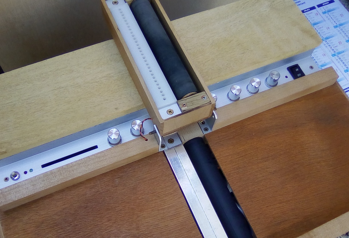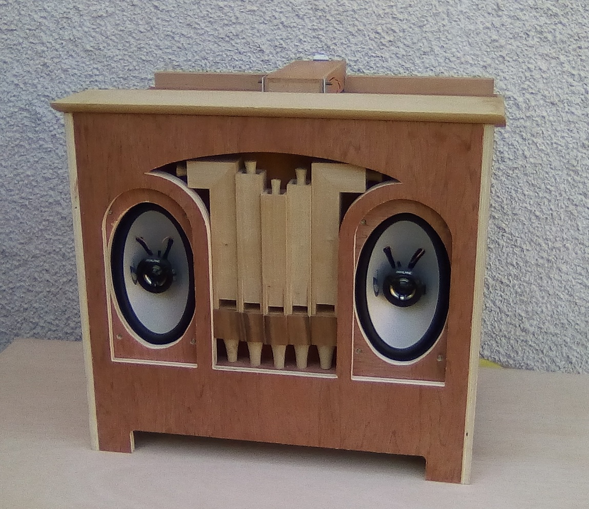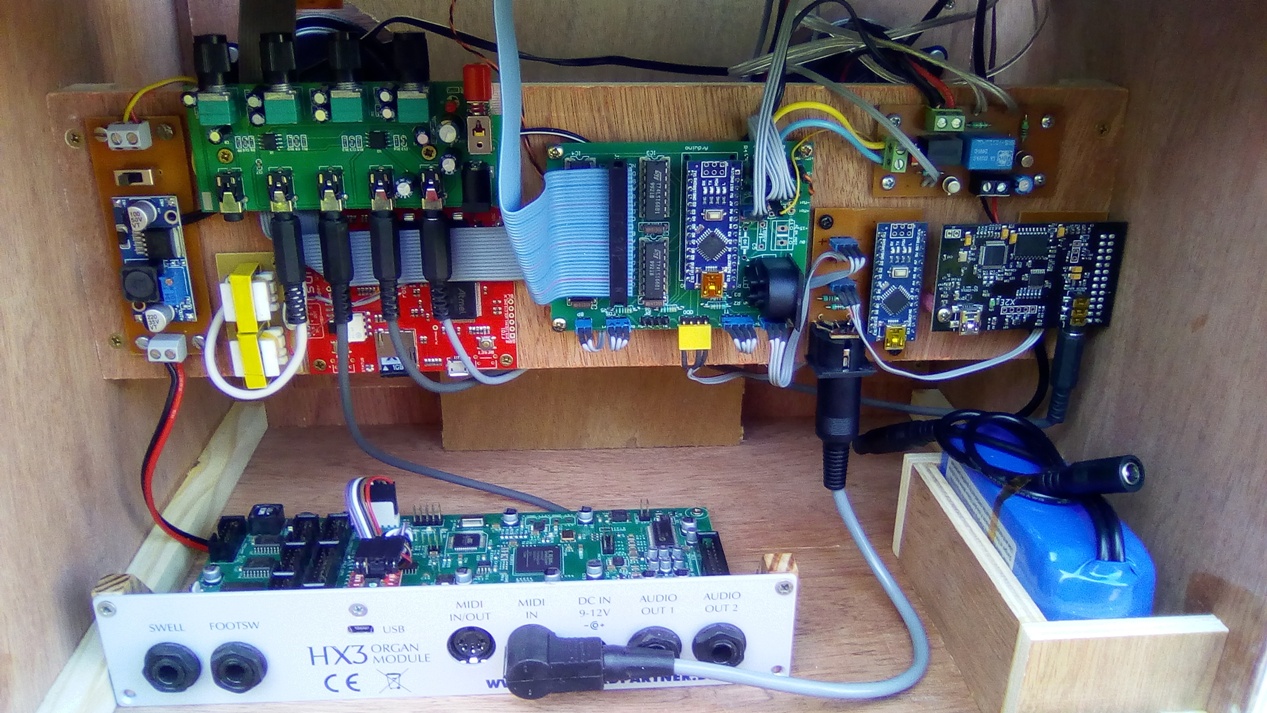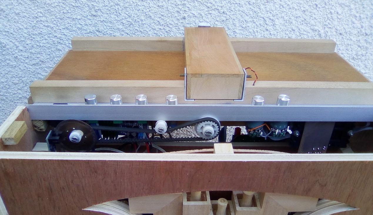 Eh bé oui. Tant qu'à faire un orgue électronique, autant qu'il sache également produire de vrais sons de l'univers de l'orgue électronique. Et quoi de plus emblématique de ce domaine que l'orgue Hammond. Bien évidemment il sera sous employé ici, mais... le son, le son.... ;o)) Et puis j'ai aussi essayé de prendre en compte les aspects pratiques et en particulier la facilité d'utilisation. Ce n'est pas parce que c'est compliqué que ça doit être compliqué à utiliser ! L'instrument vu de l'avant Techniquement il est complet et il reste à apporter une finition. Les tuyaux sont de vrais tuyaux, réalisés spécifiquement et harmonisés comme il se doit. Ils ne servent à rien, mais on peut les extraire facilement à des fins pédagogiques et souffler dedans afin de montrer ce qu'est un vrai tuyau d'orgue. Vue de dessus les principales fonctions sont accessibles sur le bandeau de commande : Insertion de cartes, lecteur optique maison à fente de 0.3 mm, commandes de transposition et de sélection d'instrument, ampli avec réglage de volume et de tonalité. Il y en a d'autres mais nous verrons ça plus loin. Les commandes L'ampli à base de TPA3116 est sur la gauche derrière la transmission vers le rouleau d'entrainement et l'inévitable capteur de vitesse (qui est également utilisé lors de la lecture de cartons. Mais si, mais si ;o)) L'intérieur Là, ça se complique un peu. Je reviendrai en détail sur chacune des fonctions mais en résumé, tout s'articule autour d'une carte centrale qui fait l'acquisition des échantillons du lecteur optique ainsi que la lecture des cartes à puces au format ProCaP II. Cette carte et entourée de cartes "clientes" :