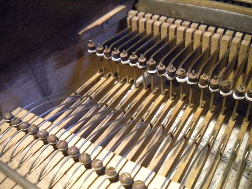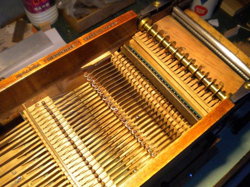 2. La mécanique. Complètement démontée et remise en état. Visserie mieux adaptée, amortisseurs en peau neufs, axe des touches garnit de feutre, touches et bascules polies, caoutchouc du galet d'entrainement changé...