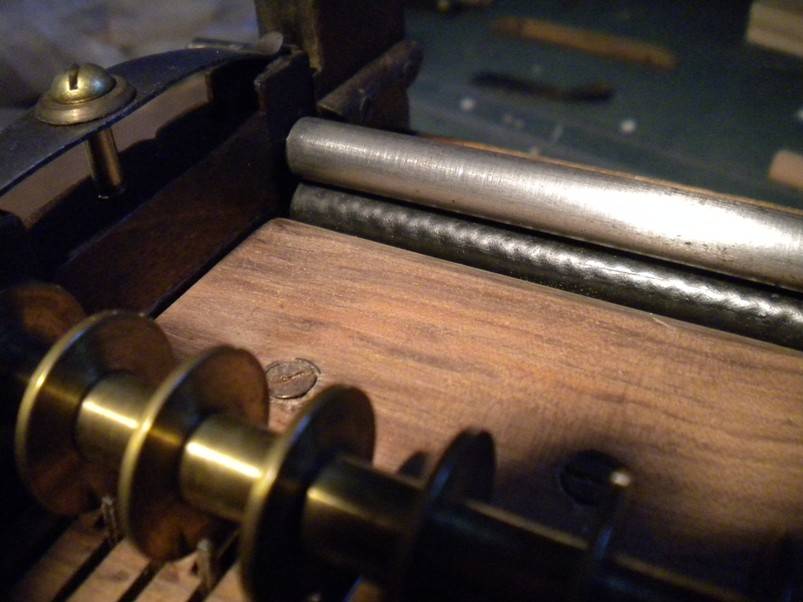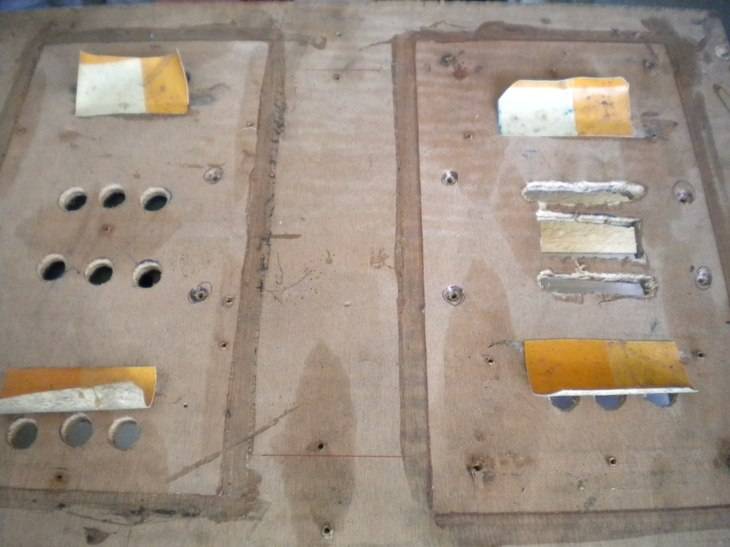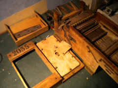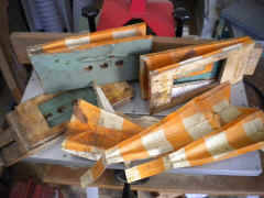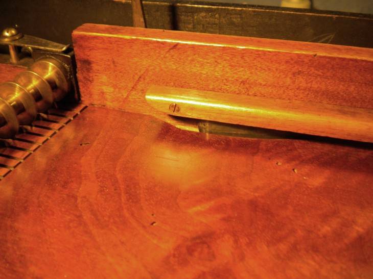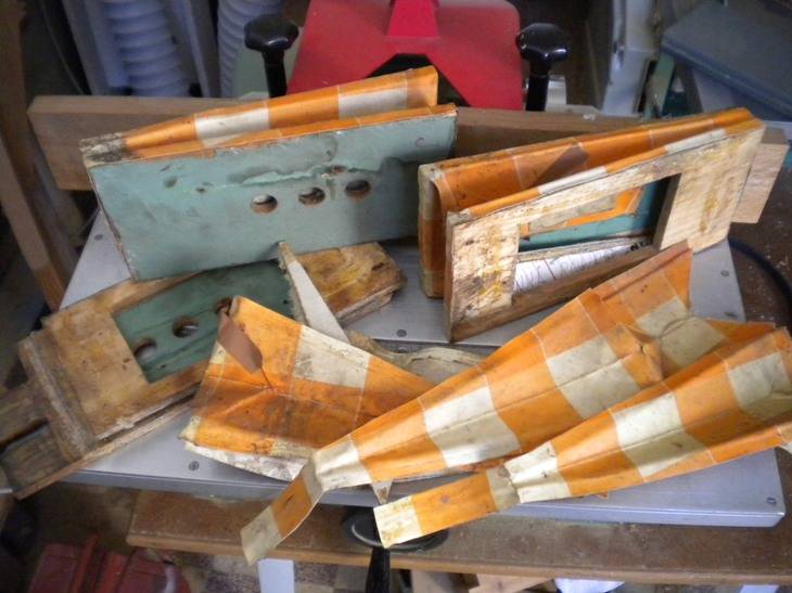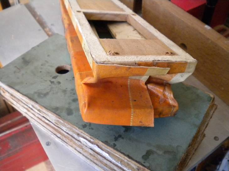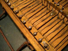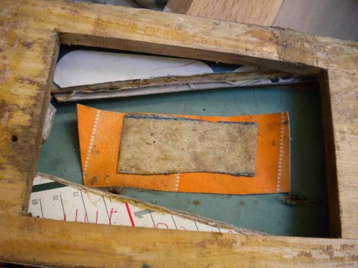 4. Le sommier d'origine en merisier était simplement fendu, et avait été remplacé par du contreplaqué, sommairement travaillé. Avec bien sûr, les inévitables clapets en toile cirée ;o) Heureusement, le restaurateur précédent avait conservé l'ancien sommier. Simplement recollé, il sera nickel.