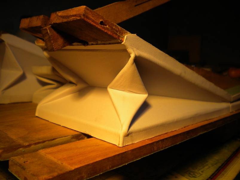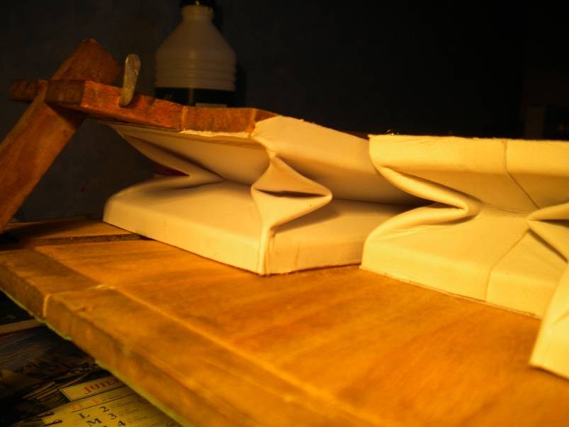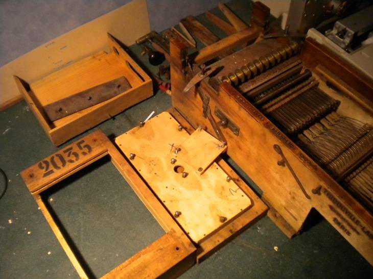 Allez... Au boulot ! 1. La soufflerie. La soufflerie au complet. Tout a été intégralement restauré. C'est le bois d'origine, recollé, redressé, remis en état. Les pompes sont collées à la colle d'os sur le sommier. En revanche, la nourrice est vissée avec interposition d'un joint. C'est comme ça d'origine. Hé-hé... Cette fois j'ai réussit et ça tient ! Les coins des soufflets et de la réserve sont pliés en losange, comme d'origine. A part à faire joli, je pense que ça ne sert sans doute à rien. Faudrait demander à Mr Thibouville, si quelqu'un le croise un jour.