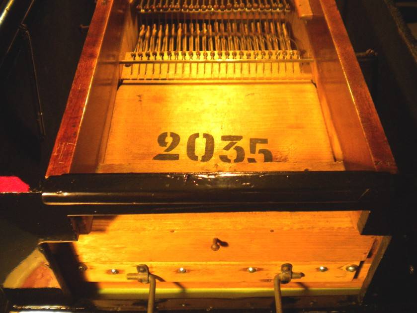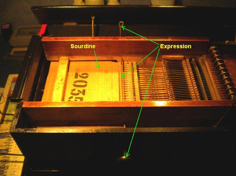 C'était une option, sous la forme d'un petit coffre qui recouvre les sorties d'anches, de manière à abaisser globalement le niveau sonore. La sourdine se glisse sous la traverse de chassis juste au-dessus du clavier.