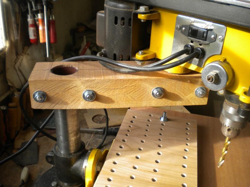 Le problème : La longueur du col de cygne de la plupart des perceuses à colonne est insuffisante pour effectuer certains perçages plein-panneau. Investir dans une perceuse radiale c'est le top, mais par forcément justifié pour quelques trous de temps en temps. C'est pas bézef 10 cm Une perceuse un peu délaissée, un tasseau, un coup de scie dans la colonne, quelques bouts de tige filetée, et hop... Les photos parlent d'elle-même. Tasseau de hêtre : 320 x 55 x 80 Les perpendicularités sont conservées et la rigidité bien suffisante pour travailler du bois. Avec 23 cm il y a de quoi voir venir ! :o) Si ça peut aider... |