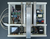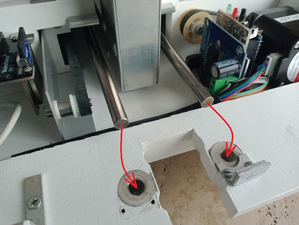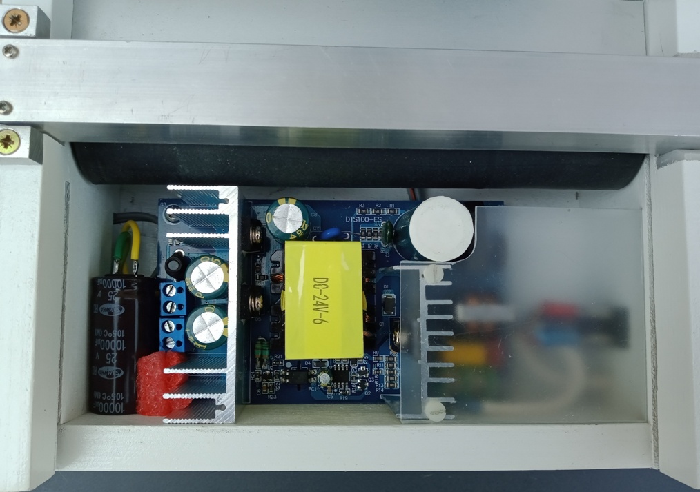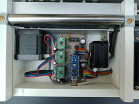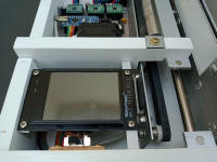 du papier jusqu'à une largeur de 160 mm. La machine terminée, une vue de dessus montrant les 4 "cavités" et la carte Grbl 2.5 axes avec les moteurs X et Y- Le contrôle poinçon, le moteur Y et l'écran autonome