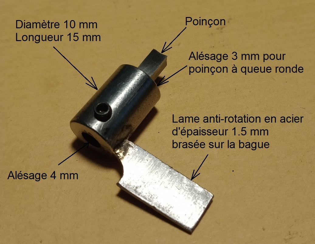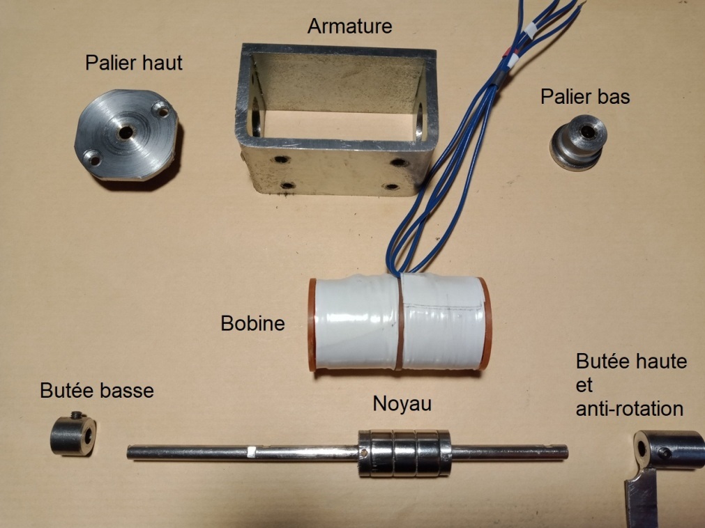 sera alimenté sous 22V. L'armature est réalisée dans une sorte de fer assez maléable (doux ?) qui provient d'équerres de soutien des équipements, dans des racks de matériel électronique. Son épaisseur est de 3 mm. Armature, noyau et positionnement des butées La bobine et l'ensemble des éléments Système anti-rotation / porte poinçon et l'électro-aimant en place Concernant les paliers : Celui du haut est maintenu par 2 vis tandis que celui du bas est