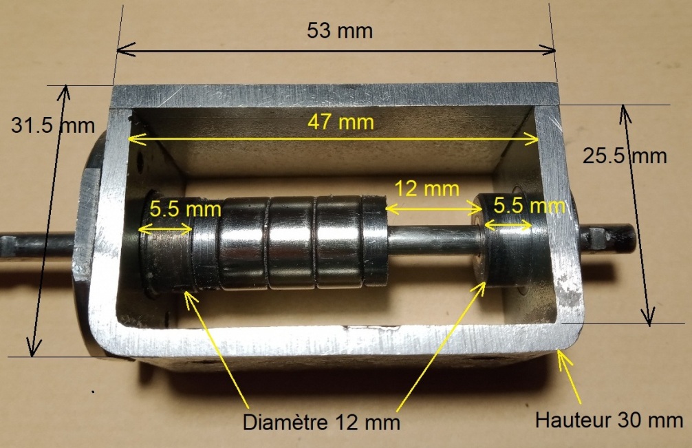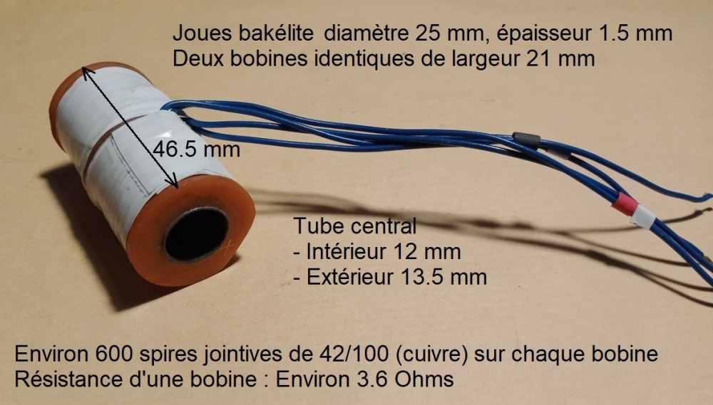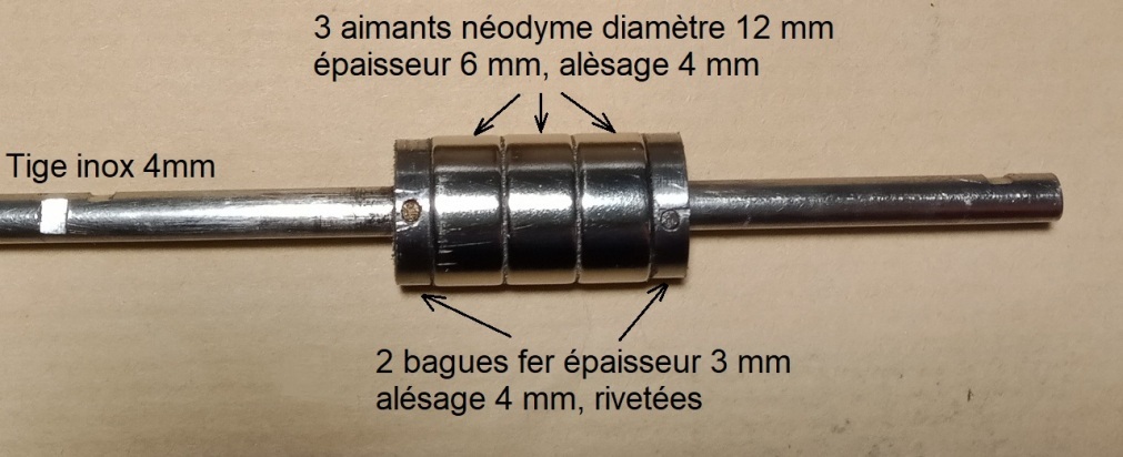 En résumé : Oui on peut réaliser 2 bobines identiques, oui on peut utiliser des aimants plus petits et oui, une tige inox va très bien. Voici quelques photos commentées et cotées de ce nouvel électro-aimant qui