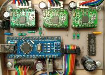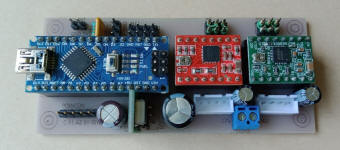 Précision : Il n'y a aucun ventilateur. Le seul organe qui chauffe dans cette machine est l'électro-aimant et il se trouve à l'extérieur. Les drivers de moteurs sont de simples cartelettes type Pololu à base de A4988 réglées à 1.7 A (Vref = 680 mV) pour les 2 gros moteurs. Pour ce courant, on peut se passer du radiateur à coller sur le composant. La dissipation thermique s'effectue par le dessous de la puce vers le PCB au moyen de vias thermiques soudés conformément à la datasheet et c'est très efficace. Ce radiateur ne peut guère apporter qu'une possibilité de court-circuits entre composants voisins et je parle d'expérience. Alors autant s'en passer ;o)