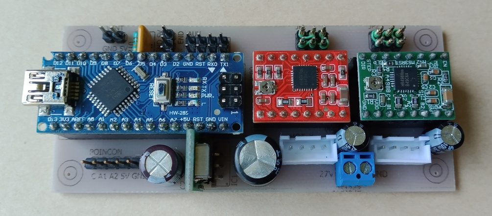 Deux cartes ont été développées autour de modules arduino Nano et conviennent indifféremment pour des machines à laser ou à poinçon. Une première carte très compacte gère 2 axes, tandis que la seconde dite "2.5 axes" peut piloter un moteur de tension papier. Ce demi-axe supplémentaire étant une réplique de Y dans le sens Y- seulement. Les 2 cartes comportent la connectique suivante :