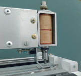 Les deux grands consommateurs d'énergie de ce montage sont les moteurs et l'électro-aimant, avec une forte prépondérence pour ce dernier : 12 A contre 2.4 A. Il faut quand-même noter qu'il fonctionne en mode impulsionnel et de manière prévisible : En moyenne 20 ms toutes les 50 ms et de façon disjointes par rapport aux moteurs qui ne tournent pas pendant qu'il est activé et vice versa. Du coup... pourquoi ne pas baser la fourniture du supplément ponctuel d'énergie nécessaire à l'électro-aimant sur la décharge d'un condensateur qui se rechargerait pendant que les moteurs tournent ? Pour se donner un peu de marge en considérant un cycle qui durerait le double du temps moyen (40 ms) et pour une résistance R de 1.8 Ohms donnée par les 2 bobines de l'électro-aimant en parallèle, il faudrait un condensateur de 0.04/1.8 = 22000 mF. C'est déjà une belle bête, mais on est dans le réaliste. Chiche ? C'est ce que j'ai fait et ça fonctionne très bien. Je ne prétendrais pas que l'on peut généraliser ce procédé, mais en tous cas ici, avec un condensateur de 10000 mF en parallèle sur les 2000 mF existants en sortie, une alim 6 A fait parfaitement le boulot, alors qu'en théorie il faudrait 22/1.8 = 12.2 A. Test : On met la machine sous tension puis on coupe l'inter secteur. Sans le condensateur additionnel il est possible d'effectuer une perforation, mais une seule et pas à chaque fois. Avec le condensateur on enchaîne 2 perforations successives et à la troisième, le carton n'est pas toujours traversé. En posant un voltmètre en sortie d'alim, on constate que l'on débute à 22.1V, on passe à 21 V après le premier trou, puis à 19 V après le second. Ensuite la tension s'écroule rapidement. Donc au final et malgré une alim sous-dimensionnée, on a tout de même une "réserve" pour 2 trous. ;o) Autre chose : La tension a été légèrement abaissée afin de diminuer l'échauffement de l'électro-aimant. Avec 24 V, en une demi-heure de travail, la température de la bobine avoisinait 80°C, valeur à partir de laquelle les aimants néodymes normaux commencent à perdre leur magnétisme. Sous 22 V on ne dépasse pas 60°C. Cool ! D'où le remplacement par du papier kraft, de l'isolant scotch blanc initial que la chaleur avait un peu rabougri.