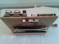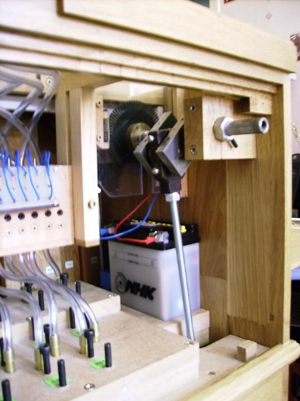 Un carton électronique un peu rallongé de manière à dégager la place pour une batterie amovible de forte capacité. Une seule batterie pour 2 orgues : économique, car c'est l'élément qui coûte le plus cher. Un autre système intégré dans un orgue. La boîte à soupapes est très accessible à l'arrière de l'instrument et tout est facile à régler.