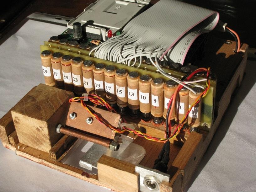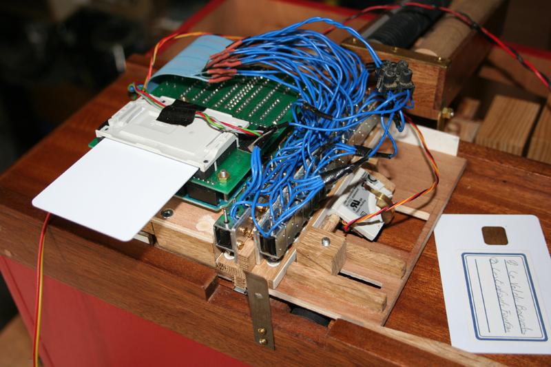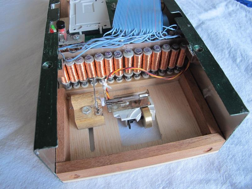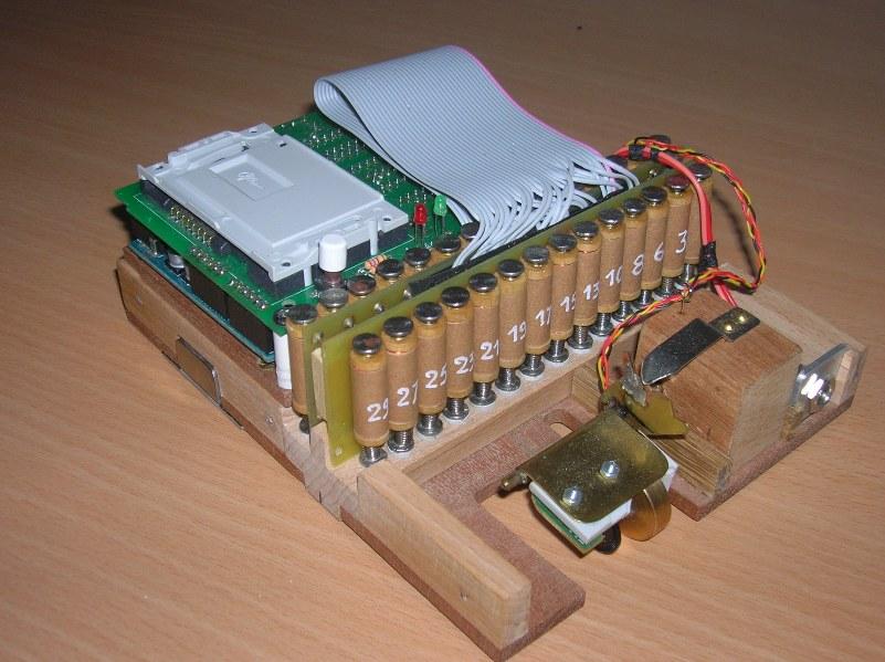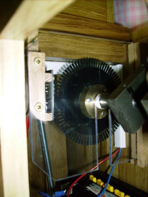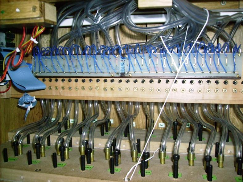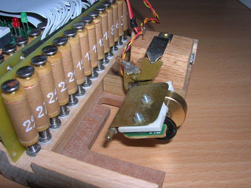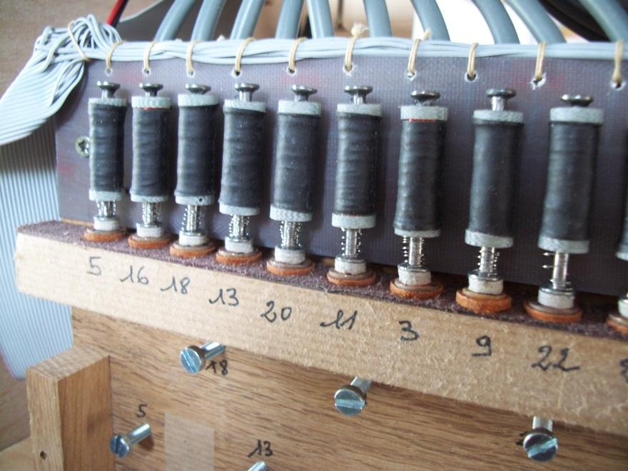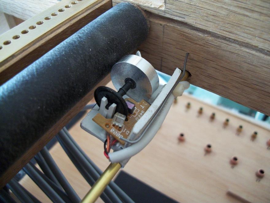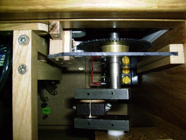 Ils ont équipé leurs orgues en même temps. Voir en particulier le capteur de vitesse sur le vilbrequin usiné par Christian D, ainsi que la planche qui regroupe les relais, baptisée "flute de pan électronique" et où chaque commande comporte son réglage de débit de manière à obtenir le même comportement en répétitions, que ce soit en commande électronique ou avec des cartons. Le disque segmenté mesure 80 mm de diamètre et comporte 80 dents. Comme il est sur le vilbrequin, et avec le jeu des démultiplications et différents diamètres, il procure bien 120 impulsions pour une avance équivalente de 60 mm de carton, soit 240 évènements.