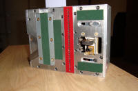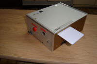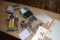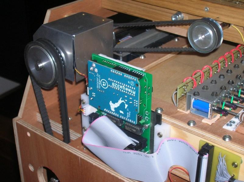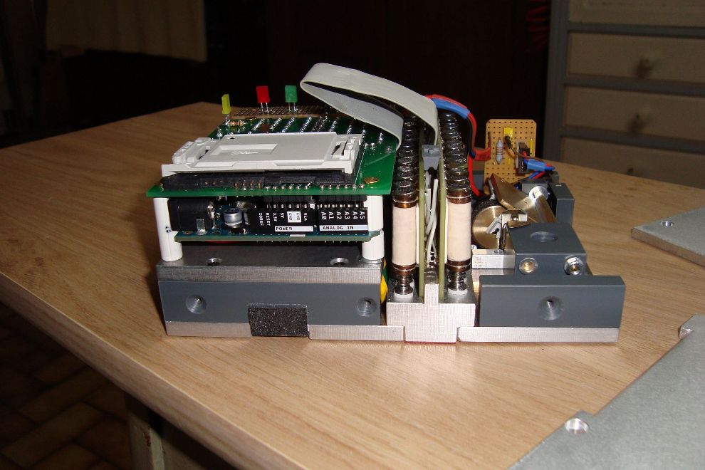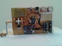Un carton électronique. A noter les superbes électro-aimants ! On remarquera aussi le capteur de vitesse entièrement fait maison à partir d'une roue segmentée de souris et de 2 optocoupleurs à fourche standards, ainsi que le système de blocage dans le chemin de carton plutôt original.