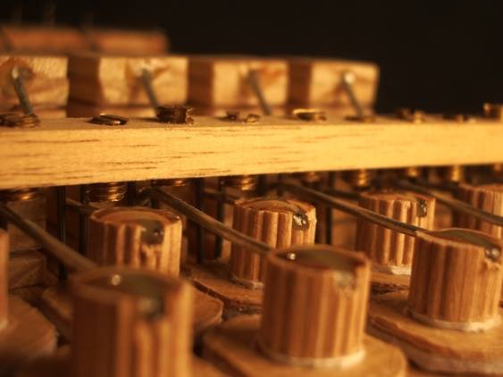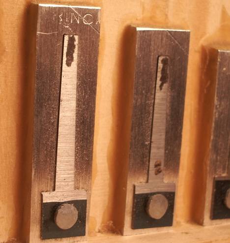 Les ressorts Remarque : Cela peut paraître laborieux, mais en fait c'est assez rapide. La dépression arrange bien les choses, car si j'ai mis un bon paquet de vis pour fixer le sommier définitivement (bien trop), il est inutile de les visser en phase de réglage. On pose simplement le sommier sur la boîte à vent, la dépression le plaque contre le joint, et rien ne fuit. Donc, entre deux étapes, la seule chose qu'il y ait à démonter est la chaîne d'entraînement. En otant le second palier ça va encore plus vite, il suffit de "dépasser" la chaîne et de retourner le sommier. Le joint de cuir (peau de vachette) Accord Les anches n'ont été accordées qu'à l'issue des opérations précédentes. J'ai utilisé un accordeur électronique (Korg...). Pendant toute cette opération, il faut veiller à laisser l'accordeur au même endroit, et surtout (!) ne pas le poser sur l'instrument car la retransmission des vibrations à son micro interne fausse pas mal de choses. Pour travailler les anches, j'ai utilisé une mini fraise (et non une meule qui parait-il chauffe davantage le métal). Pour augmenter la fréquence de l'anche, on enlève de la matière à l'extrémité. Si on est trop haut, on peut légèrement baisser la fréquence en travaillant côté rivet (mais faudrait pas, car ça fragilise). Traces d'accord... L'avantage avec les anches, c'est qu'il est assez facile de les accorder pile poil sur la note, et que cet accord ne change quasiment plus ensuite. Donc, l'accord peut être réalisé nickel de chez nickel !