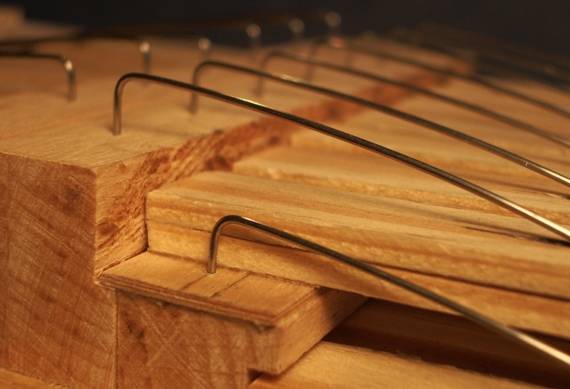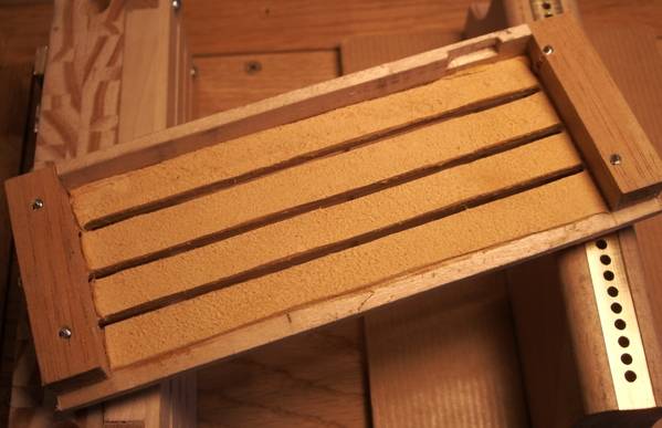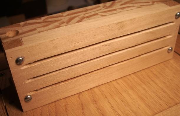 Sonorité Voici un enregistrement effectué "anches nues". Il s'agit de la valse d'Amélie Poulain, et l'arrangement est de Bernard Caudroy Je trouve que ça ferraille un peu, surtout dans les aigues. Dommage, car le morceau vaut mieux que ça! Alors, j'ai remis en questions plein de choses : la matière du sommier et des porte-anches, les anches elle-mêmes, la façon dont elles sont fixées, la pression à laquelle elles fonctionnent... Pas question de changer d'anches, et la pression ne modifie pas grand-chose. En revanche, la nature du sommier et des porte-anches semble avoir une certaine importance. En fixant les anches sur une planche beaucoup plus épaisse, il semblerait que le bruit de ferraille s'atténue un petit peu. Mais bon... dans un accordéon, elles sont fixées sur quelques centimètres cubes de bois et tout va bien, et puis il est trop tard pour faire des grosses modifications de ce côté. Alors... Ceci dit, il y a tout de même une différence fondamentale entre un accordéon et mon montage: Dans le premier cas, les anches sont dans le soufflet, et en aucune manière, le son n'arrive directement aux oreilles de l'auditeur. Alors que là, surtout en l'absence de coffret comme lors de cet enregistrement, elles sont en vue directe. L'idée est donc d'essayer de les couvrir "un peu", pour tenter de filtrer tous ces sons indésirables. Le pb, c'est que ça n'a pas été prévu, et qu'il n'y a pas trop de place. Un premier essai avec des petits boîtiers en carton épais a tout de même donné des résultats plutôt encourageants. Le capot des anches J'ai donc fabriqué ces petits capots en planchettes de peuplier de 3 mm d'épaisseur. Au départ, les fentes mesuraient environ 1 mm de large, avec pour double rôle, d'entrée pour l'air, et de sortie pour le son. Le premier résultat est que ça a fortement atténué le bruit de ferraille, mais le son est devenu un peu nasillards. Bof alors... Et puis, suite à la discussion à propos de la peau de lapin, j'ai recouvert l'intérieur des capots d'une peau de chamois. En élargissant un peu les fentes (à peine 1.5 mm), tout a changé, et j'ai à peu près obtenu la sonorité que je voulais... Youpi!! Ben, ça n'aura pas été sans mal.