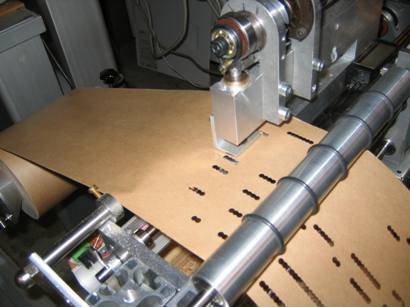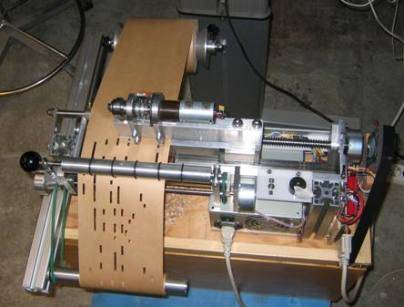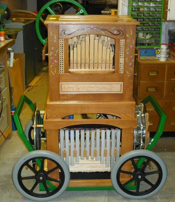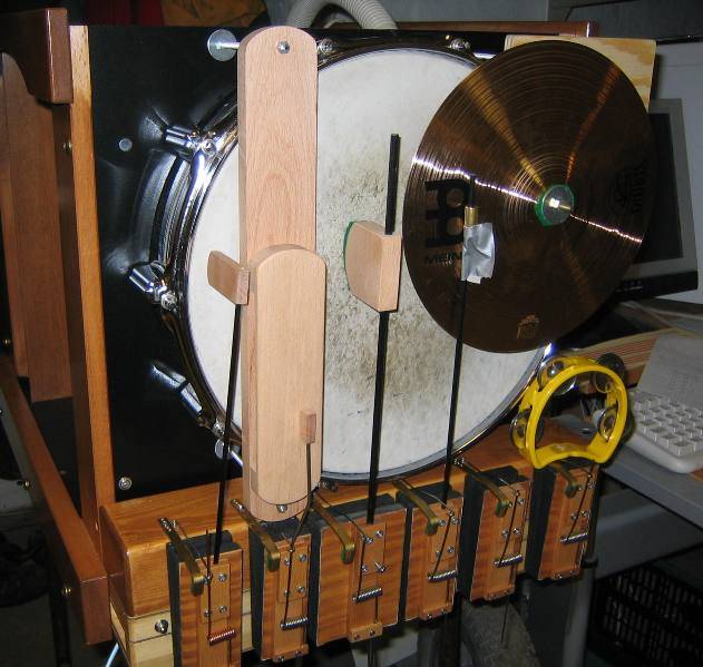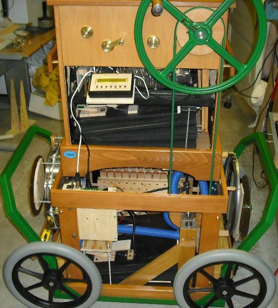 La perfo en cours de fonctionnement Détails de la tête La carriole abrite un système de percussions autonome, entièrement à action pneumatique comportant sa propre soufflerie, entrainée par une courroie reliée à la manivelle. L'orgue et les percussions sont commandés au choix, par le papier de l'orgue ou par des systèmes midi indépendants. Un seul mot : Méga bravo Roberto !!
