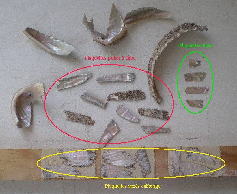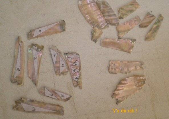 Bien sûr, on trouve dans le commerce des plaquettes de nacre calibrées, et en cherchant bien, sans doute aussi des motifs prêts à incruster. Mais pourquoi ne pas le faire soi-même ? En tous cas, voilà une belle occasion de travailler un nouveau matériau. Et puis pour tout dire, je me suis largement inspiré de la méthode présentée par Frank (Caribou) chez les tontons luthiers, et c'est d'ailleurs ça qui m'a donné envie de me lancer :o) L'idée c'est d'utiliser la nacre de quelques coquilles d'ormeaux issus de la pêche familiale. Depuis le temps qu'elles sont là "à faire joli", ce ne sera pas pire que de s'en servir de cendriers... Attention !! : La poussière de nacre est extrêmement agressive. Toujours travailler avec des lunettes et un bon masque . Le motif Une rose des vents du genre de celle qui est sur le premier orgue. C'est une figure géométrique ne comportant que des lignes droites et donc très simple pour un premier essai. Préparation des plaquettes