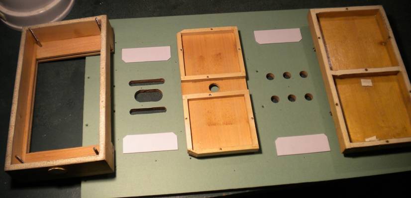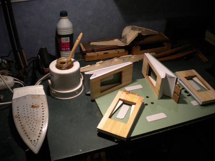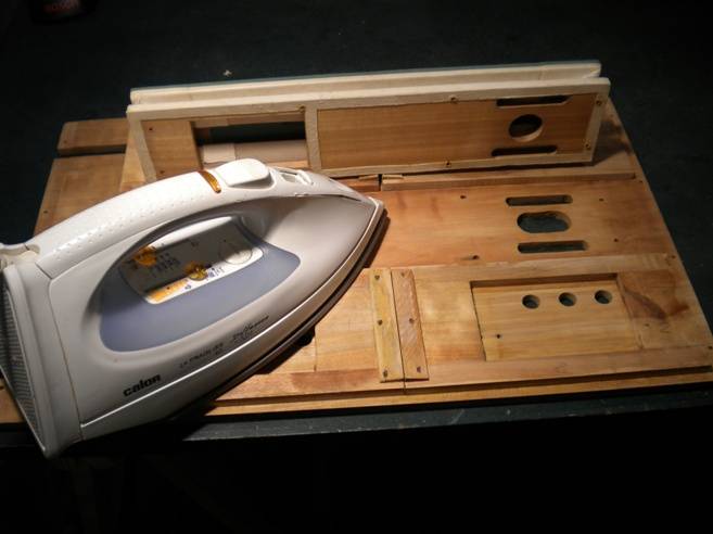 battants et les dormants sont également en merisier, et l'on obtient assez facilement un très bon état de surface. Détail de l'articulation des soufflet : Ben c'est du beau boulot quoi. Remise en état Le papier du dessus du sommier est remplacé par du papier neuf, de même que celui qui constitue le siège des clapets à l'intérieur des battants. J'ai trouvé du kraft teinté qui convient parfaitement. Pour faciliter le remontage, les emplacements des trous des différentes vis avaient été reportés sur un calque, puis reperforés à l'aide d'un pointeau. La réserve est prête. Tout est prêt pour le regarnissage des poches. Les clapets sont en place, l'articulation des battants est posée, les éclisses cont collées... Selon l'expression consacrée : c'est le moment de "Faire chauffer la colle" ! Ca se présente plutôt bien non ? Le chantier collage Les soufflets sont terminés... Pas eu le temps de faire des photos pendant. Le fer à repasser à l'envers a son thermostat bricolé pour descendre à environ 90°C. Il sert à chauffer le bois avant d'appliquer la colle. Comme ça on a tout son temps. Pour de plus grandes pièces, j'utilise un chauffe-plats. Pour la colle, c'est un chauffe-biberons. Thermostat bricolé là aussi, mais pour qu'il chauffe plus fort. Petite entorse à l'original : Je n'ai pas vraiment réussit à plier les coins de soufflets en losange. Enfin si, mais ça ne tenait pas en pression... C'est peut-être moins joli, mais j'ai fait comme je savais faire. Et puis ça ne se voit pas ! ;o). Une bonne soirée de boulot. Le sommier présente un léger galbe. Inévitable pour une planche de 300 mm de large et 10 mm d'épaisseur. Une fois collés dessous, les soufflets risqueraient de figer ce galbe. Alors, auparavant, il est plus que judicieux de mettre en place les boîtiers de transfert du dessus afin qu'ils plaquent bien à plat. Quand on pense que tout ça est caché sous la mécanique... On remarque des morceaux de peau dans le boitier de droite. Mais qu'est-ce ? En fait le bois est d'une qualité assez quelconque, avec des noeuds. Eh bien chaque noeud est masqué intérieurement avec un morceau de peau pour eviter une fuite au cas où le noeud se séparerait ! Bien vu non ? Assemblage Petite difficulté : Les pièces de jumelage en triangle ne sont pas exactement interchangeables. Elles sont "presque" identiques et les perçages pour les vis sont "presque" au même endroit. Alors, pour éviter de faire des trous supplémentaires dans les battants quand plus rien ne pourrait bouger, tout est assemblé trou pour trou avant collage. Ensuite on trace, on démonte, et les soufflets sont collés uns par uns sur le tracé. Et voilà ! Ensuite, il reste à remettre le sommier sur la base, remonter la mécanique,