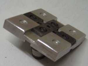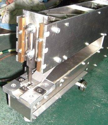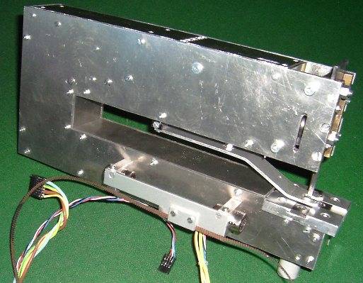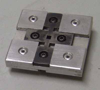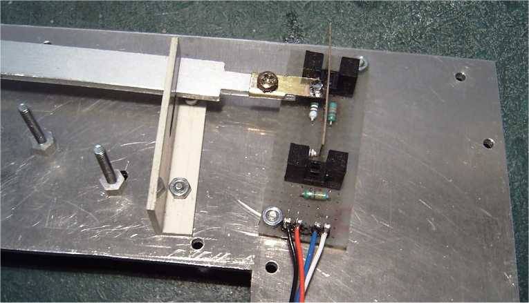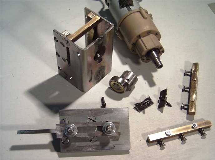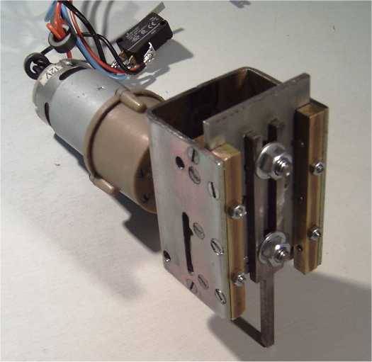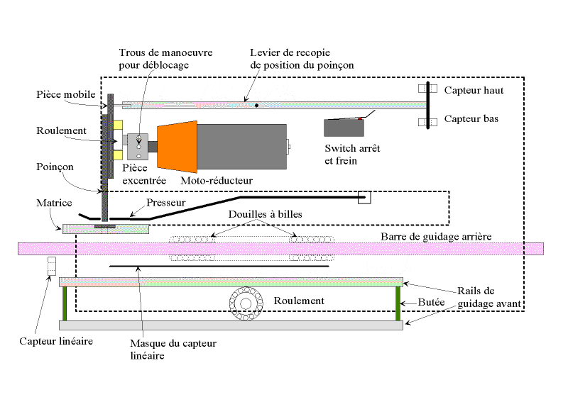 | Elle constitue le coeur du système, et de la qualité de sa réalisation dépendront grandement les performances et la fiabilité de la machine. On décrira d'abord le mécanisme, ensuite le procédé de fabrication de la matrice, puis la structure qui soutient et enveloppe tout ça, et enfin les différents capteurs. Je dirai aussi un mot du refroidissement, avant de présenter des photos de la tête terminée. Le diagramme ci-après montre le principe de cette tête La base de cette tête est un groupe moto réducteur de visseuse. Le modèle choisit fonctionne en 12 volts, et l'on ne prélèvera que le moteur et son train épicycloïdal. Pour information, le mandrin de la visseuse est fixé au moyen d'une vis, pas à gauche au fond du mandrin, et le mandrin lui-même est vissé, pas à droite sur la broche de sortie du réducteur... ça vous évitera de chercher autant que moi! Le filetage de l'extrémité de la broche est supprimé... au tour (ça commence bien!). Une pièce spécifique est montée en sortie du réducteur. Cette pièce comporte un axe excentré portant un roulement à bille de rollers (alésage 8, diamètre extérieur 22). Des trous de 3 mm disposés à la périphérie de cette pièce (voir photos suivantes) permettent de faire tourner le moteur manuellement, à l'aide d'une queue de forêt par exemple, et de remonter le poinçon lors d'un éventuel bourrage. La course totale de l'excentrique est de 12 mm (décentrage des axes de 6 mm donc). Cette pièce se réalise assez facilement au tour (promis, j'arrête), mais peut être également constituée d'un rondin sur lequel on vient rapporter un axe portant le roulement. Dans ce cas, une perceuse suffit, et même si ça ne tourne pas vraiment rond, ben c'est pas grave, c'est précisément ce qu'on cherche ;o) (ouf!) Le moteur est fixé à l'arrière d'une pièce en forme de U. A l'avant de cette pièce, une plaque en acier de 4 mm coulisse entre des glissières faites de barres de laiton de 7x7. Cette plaque porte le poinçon à l'avant, de coulisses horizontales (du même laiton) espacées de 22 mm à l'arrière, ainsi qu'une tige commandant la bascule de commande d'arrêt du moteur. Le démontage s'effectue en ôtant la partie avant des glissières, qui comportent également un système de rattrapage de jeu. Cette partie de la tête est des plus délicate à fabriquer et a requit de nombreuses heures d'ajustage. Le fonctionnement doit être doux, sans jeux et sans point dur! Une pièce pas facile à réaliser non plus... Le support est constituée de l'assemblage de plaques d'aluminium de 4 mm collées à l'époxy et rivetées, de manière à ménager des rainures en forme de croix. La matrice proprement dite est constituée de 4 pièces en acier provenant d'une lime, détrempée pour l'usinage (meule + lime!) et retrempées ensuite. Ma "méthode" de détrempe est de faire chauffer la lime dans un feu de cheminée toute une soirée, et de la laisser refroidir tranquillement avec le feu qui s'éteint. Le lendemain matin on peut commencer à bosser. Le truc reste quand même dur hein, faut pas croire! Mais ça se coupe à la scie à métaux, et c'est la lime qu'on tient dans la main qui bouffe l'autre, c'est bien ce qu'on veut non? ;o) Pour la retrempe, on chauffe au rouge cerise avec un chalumeau. Et plouf... dans l'eau! Oui je sais c'est sans doute pas très académique, mais ce n'est pas le première fois que je fais ça et ça donne à peu près ce que je veux. Le dessous m'a fait me faire quelques noeuds au cerveau, car il faut prévoir la fixation, et penser à un système pour ne pas perdre les écrous de blocage lors du changements des éléments. Ah! si j'avais une fraiseuse... Pour être honnête quand même, les pièces en acier de la matrice ont été ajustées d'équerre et "rectifiées" au tour (encore! Pourtant t'avais dit?...). Pièces sur le porte-outil, une meule fine dans le mandrin et vitesse maximale. La structure générale de cette tête est en quelque sorte un coffre, constitué d'un sandwich de plaques de tôle d'aluminium d'une épaisseur de 3 mm et de 50 mm de large coincées entre les 2 côtés en forme de C, tirés du même matériau. L'assemblage se fait avec de la tige filetée de 3 qui maintient les éléments plaqués les uns contre la autres. Les dimensions sont tout de même assez imposantes: la profondeur du col est de 250 mm, longueur totale 350 mm. La masse totale est tout de même de 3 kg. La tête presque terminée, l'intérieur, et le déchaussoir réglable La tête comporte un levier qui suit les mouvements du poinçon. Ce levier a un double rôle: